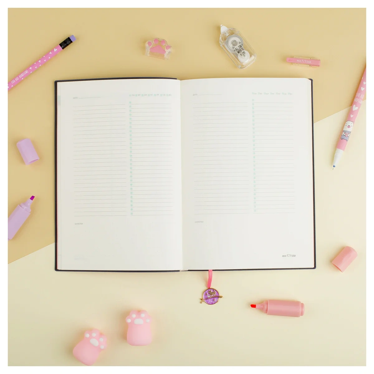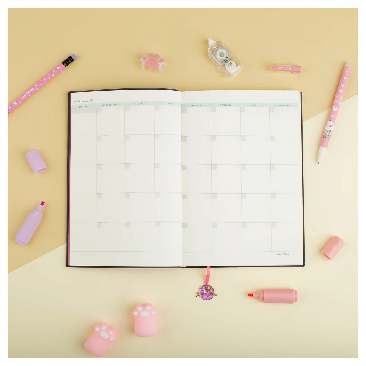 Недатированный ежедневник MESHU 'Find your way. Pink' формата А5 — отличный помощник для тех, кто ценит своё время. Размер изделия — 143*210 мм. Внутренний блок состоит из 136 листов кремовой бумаги повышенной плотности 80 г/м?. Ежедневник содержит справочные материалы. Обложка сделана из ультрамягкой экокожи. Дизайн подчёркивают закладка-ляссе с подвеской и отделка глиттером.