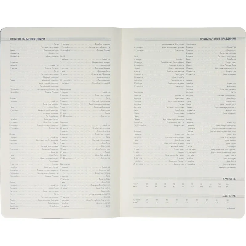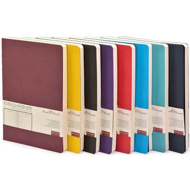Ежедневник также содержит справочную информацию и телефонную книгу. Элегантная закруглённая flex обложка из гладкого кожзама имеет гибкую конструкцию. Интегральный переплёт позволяет сэкономить место в рабочей сумке или портфеле — ежедневник можно просто свернуть в трубку или согнуть пополам.