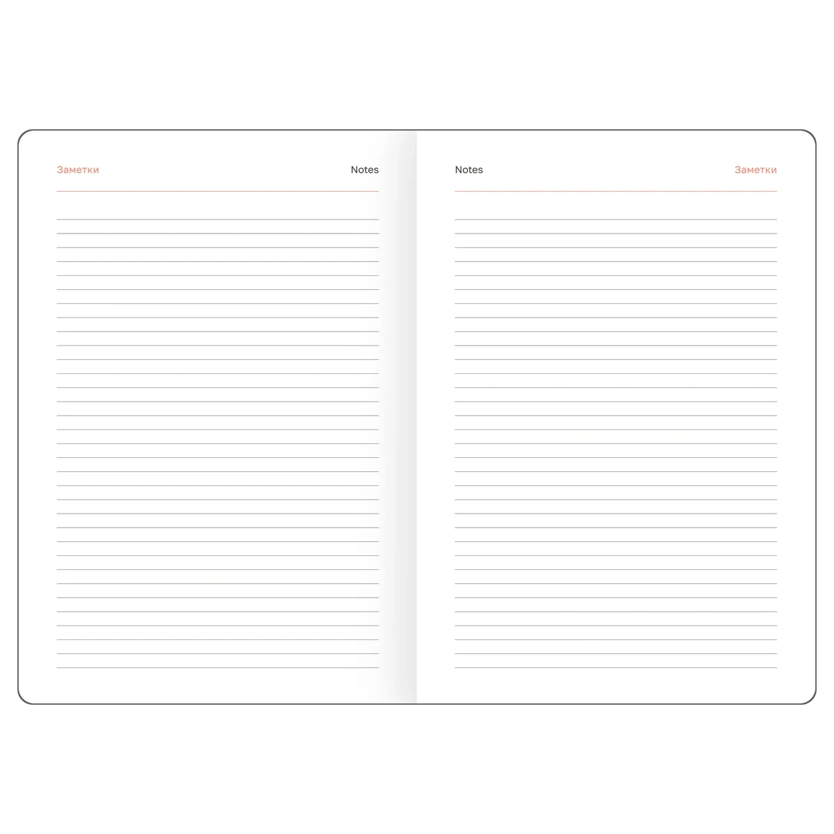 Внутренний блок содержит линованные страницы с полем для даты и почасовым планингом, что удобно для записи встреч, идей и задач. Внутри предусмотрена справочная информация, годовой планер, календарь и другие полезные сведения. Изделие подходит под персонализацию.