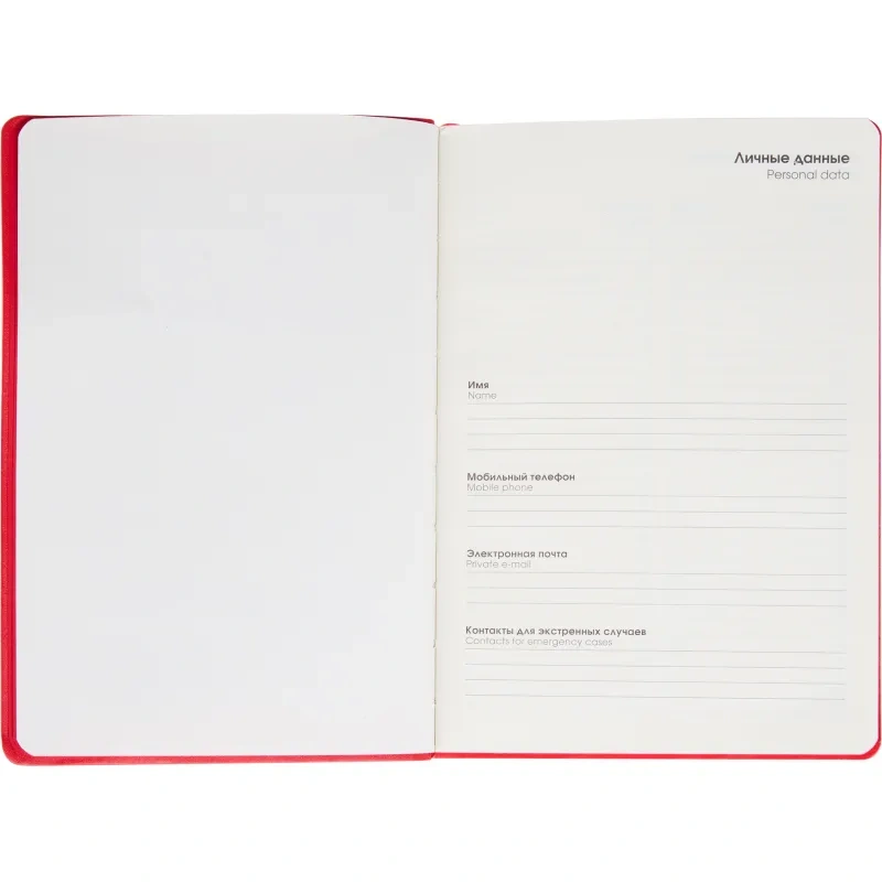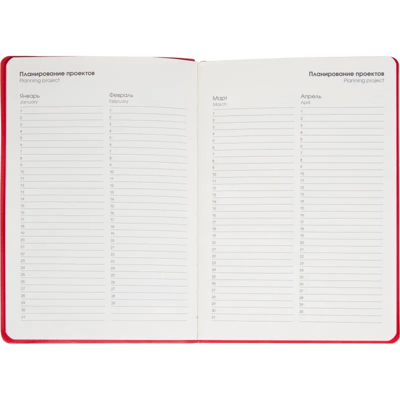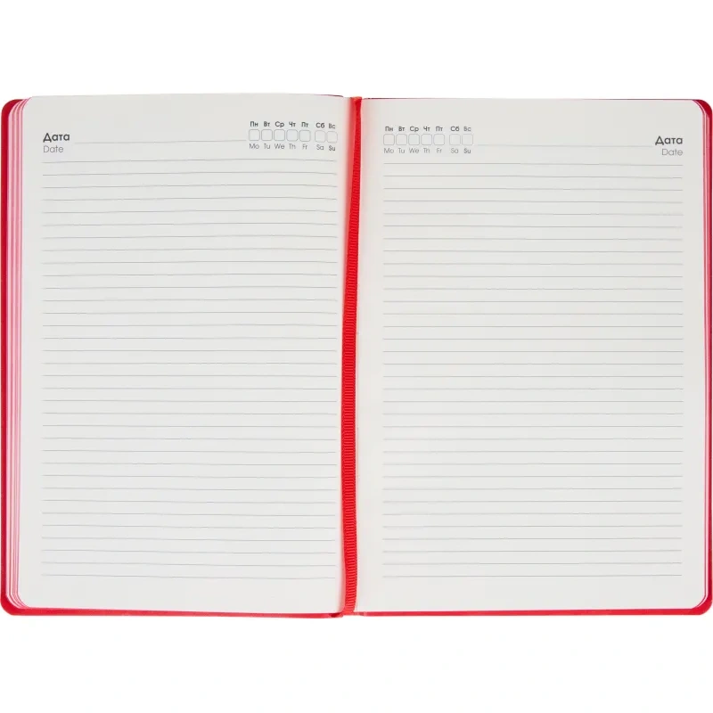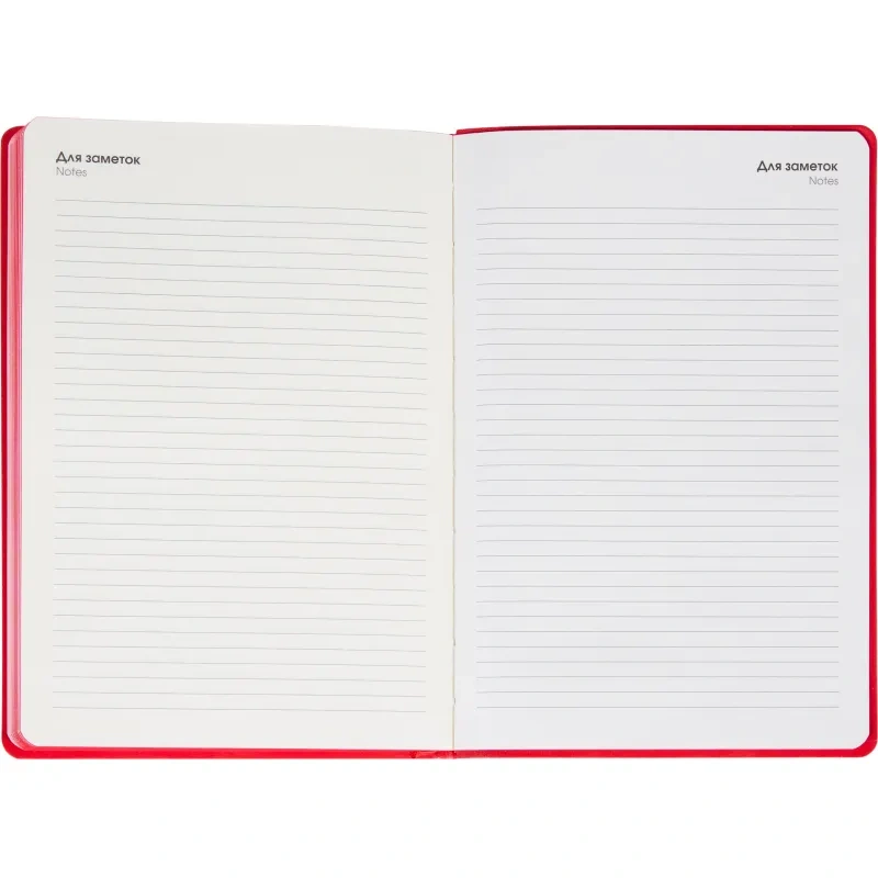 Ежедневник размером 21×14.5 см предназначен для повседневного использования и организации записей. Обложка выполнена из искусственной кожи Soft Touch в однотонном красном цвете. Её гладкая, бархатистая поверхность делает изделие приятным на ощупь и подчёркивает сдержанный стиль. Скруглённые уголки и окрашенный в тон обложке красный обрез придают ежедневнику аккуратный и завершённый внешний вид.