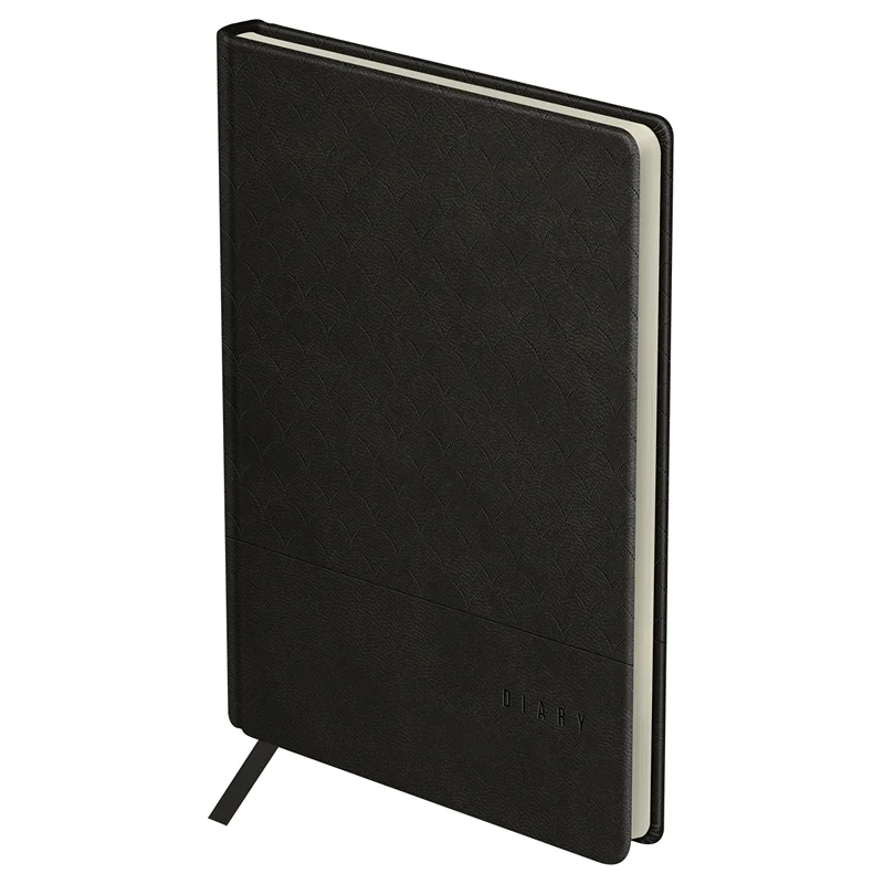 Стильный недатированный ежедневник BG формата А5 серии 'Pattern' станет отличным помощником в планировании дел. Изделие имеет размер 145*205 мм. Внутренний блок – 136 листов офсетной бумаги плотностью 70 г/м2 с печатью в 2 краски. Твёрдая обложка выполнена из экокожи тёмно-серого цвета с оригинальным тиснением. Перфорированные уголки и закладка-ляссе обеспечат комфорт и удобство при использовании ежедневника. Внутри есть полезный справочный материал. Недатированный ежедневник подходит под персонализацию. Индивидуальная упаковка в пакет.