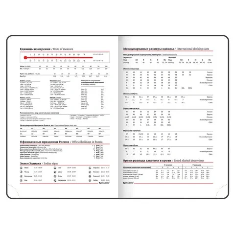 Внутренний блок включает 136 листов белой бумаги плотностью 70 г/м2. Каждая страничка имеет перфорированный угол. Благодаря стандартному формату А5 ежедневник удобно брать с собой. Твердая обложка, стилизованная под ткань, подходит для горячего тиснения. Снабжен резинкой-фиксатором, благодаря чему ежедневник не откроется в сумке или портфеле. Форзац ежедневника представлен картами мира и России. Дополнением является закладка-ляссе, с помощью которой при необходимости можно быстро открыть ежедневник на нужной странице и держатель для ручки. Помимо прочего ежедневник снабжен справочным материалом.