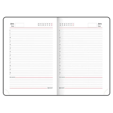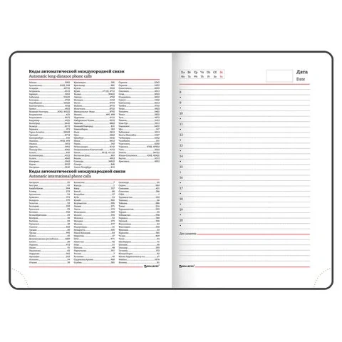 Внутренний блок включает 160 листов белой бумаги плотностью 70 г/м2. Каждая страничка имеет перфорированный угол. Благодаря стандартному формату А5 (138x213 мм) ежедневник удобно использовать как в офисе, так и на выездных деловых встречах. Твердая обложка, стилизованная под гладкую кожу, подходит для горячего тиснения. Снабжен магнитной застежкой, благодаря чему ежедневник не откроется в сумке или портфеле. Форзац ежедневника представлен картами мира и России. Дополнением является закладка-ляссе, с помощью которой при необходимости можно быстро открыть ежедневник на нужной странице. Помимо прочего ежедневник снабжен справочным материалом. Выполнен в комбинации из двух цветов - черный и красный.