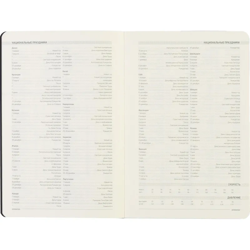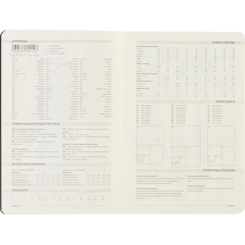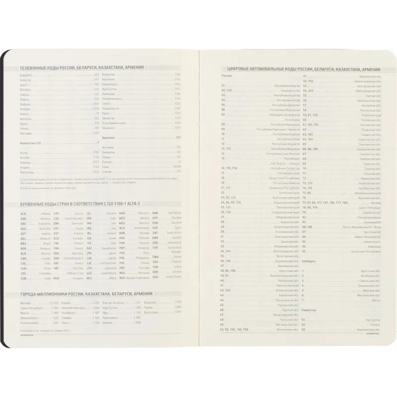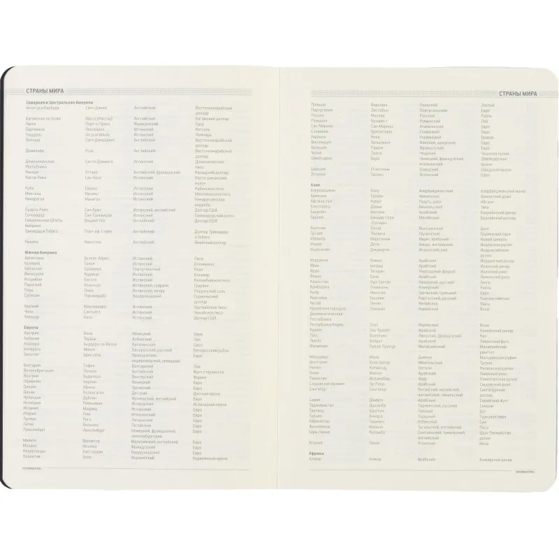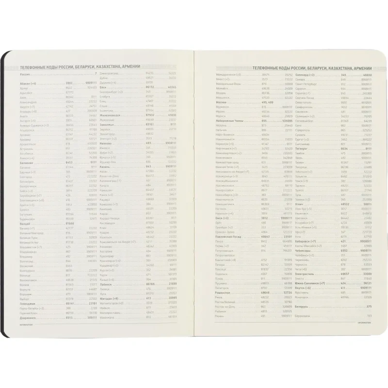 Ежедневник крепится с помощью сшивки. В нём имеется информационно-справочный блок с международными кодами городов, цифровыми кодами ГИБДД, телефонами первой необходимости и другими полезными данными. Он готов к персонализации, что делает его отличным вариантом для корпоративных нужд.