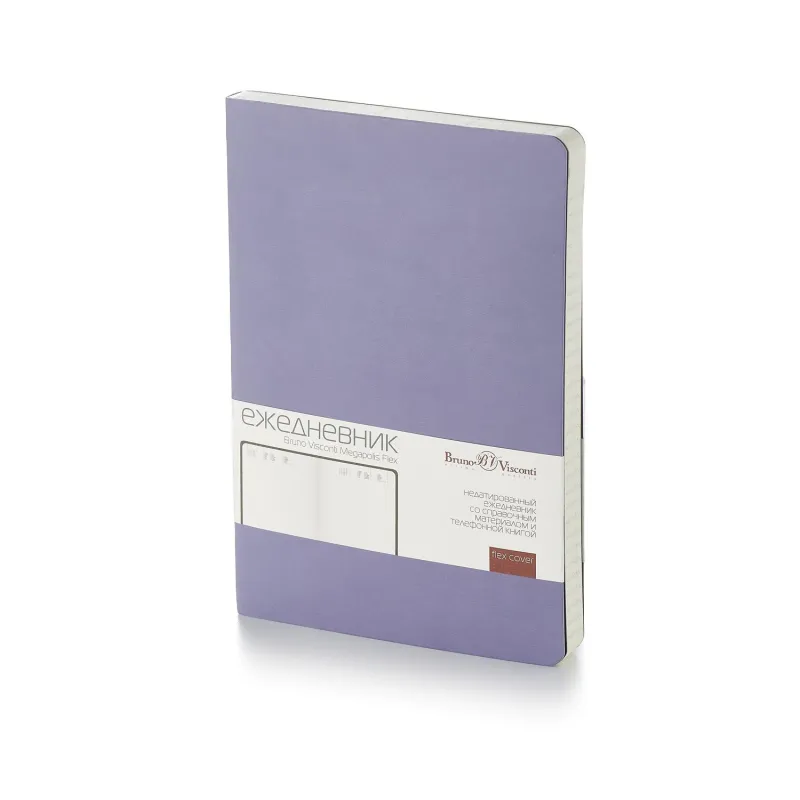 Ежедневник недатированный Bruno Visconti Megapolis Flex. Формата A5, размер изделия - 140x210 мм. Обложка сиреневого цвета выполнена из искусственной кожи. Блок: недатированный, 136 листов (272 страницы) высококачественной бежевой бумаги (плотность 70 г/кв.м) в линейку, печать в 1 краску. Тип крепления - книжный переплет. Содержит информационно-справочный блок - международные коды городов мира, европейские аэропорты, цифровые коды ГИБДД, среднемесячная температура, телефоны первой необходимости, штриховой код, неметрические единицы, междугородные коды России и мира, денежные единицы, размеры одежды. Ежедневник отлично подойдетдля работы в офисе. Готов к персонализации.