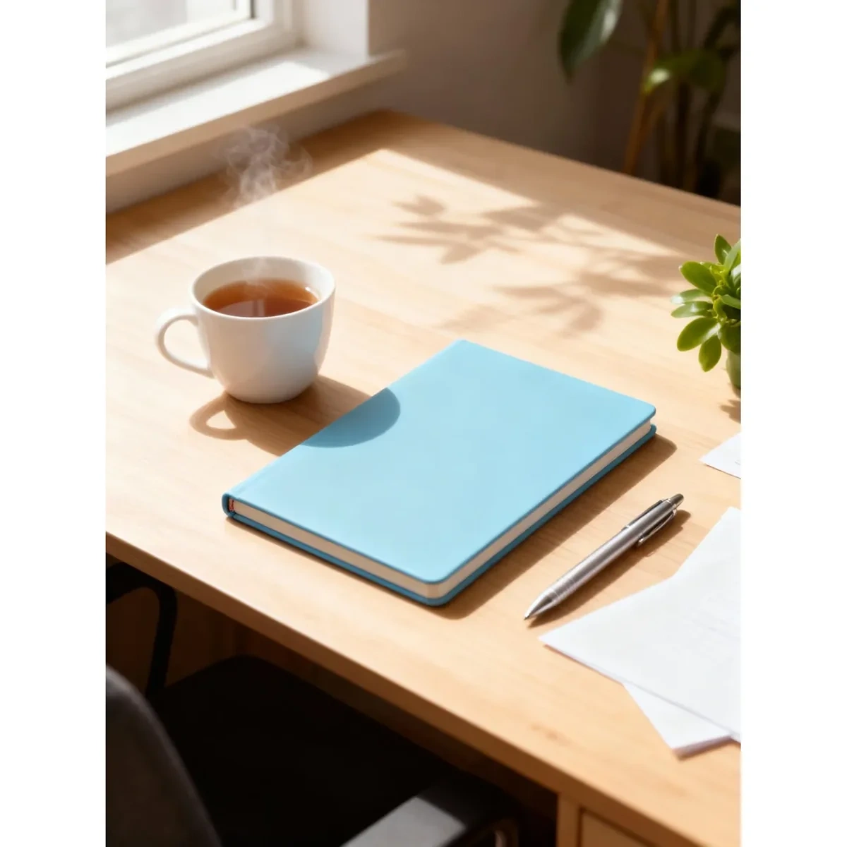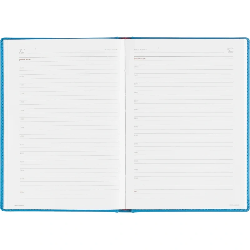 Ежедневник формата A5 с твёрдой обложкой синего цвета, выполненной из искусственной кожи, идеально подойдёт для работы в офисе. Внутренний блок состоит из 136 листов (272 страницы) белой офсетной бумаги плотностью 90 г/кв.м. с линейкой. Печать выполнена в два цвета.