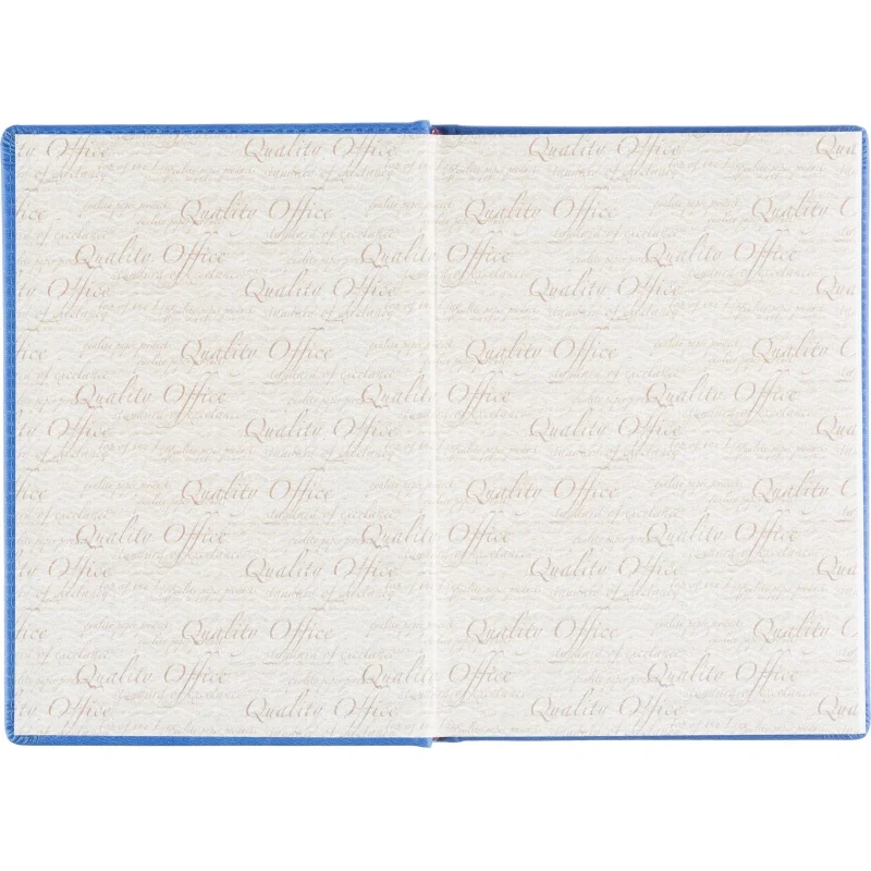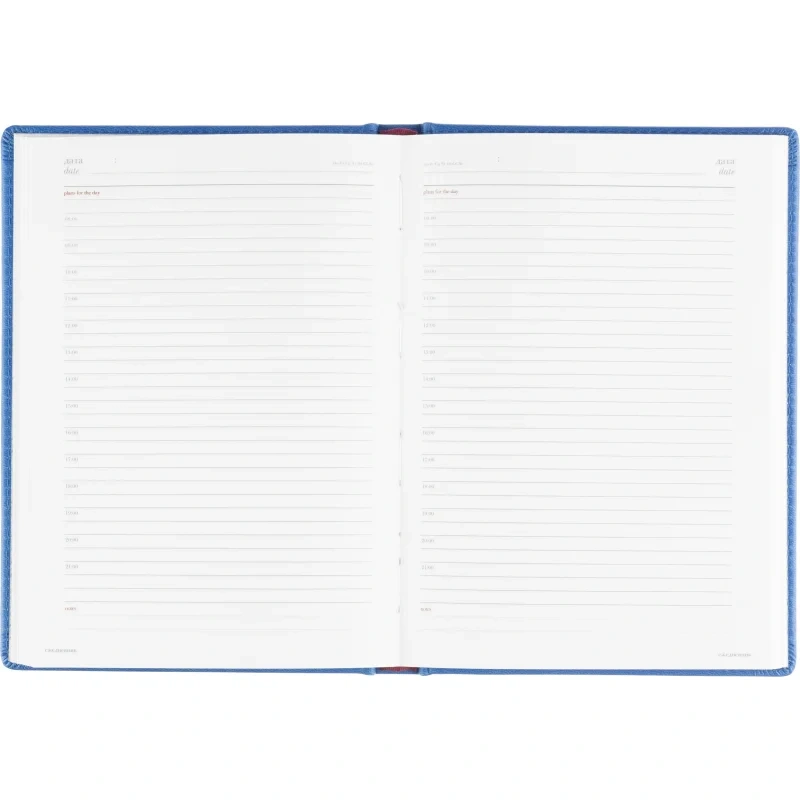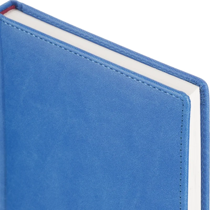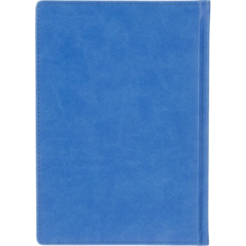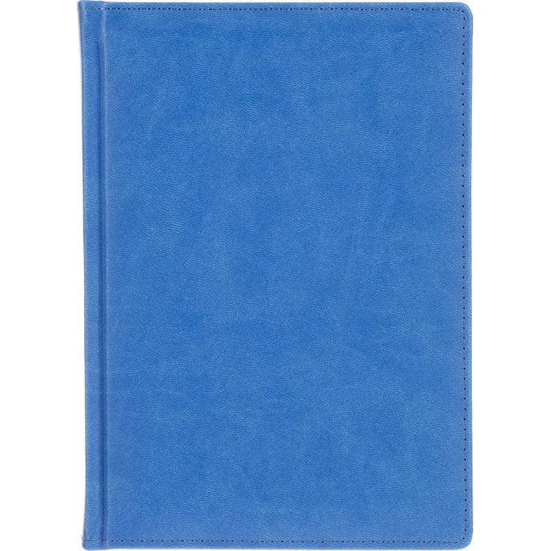 Ежедневник формата A5 с твёрдой обложкой синего цвета, выполненной из искусственной кожи, идеально подойдёт для работы в офисе. Внутренний блок состоит из 136 листов (272 страницы) белой офсетной бумаги плотностью 90 г/кв.м. с линейкой. Печать выполнена в два цвета.