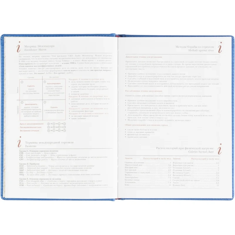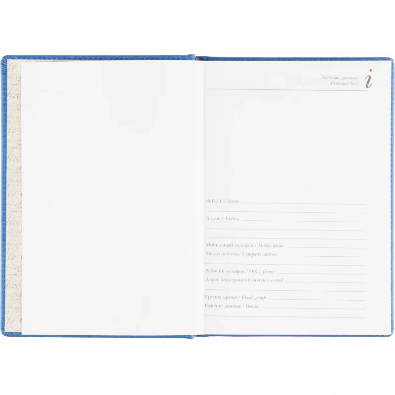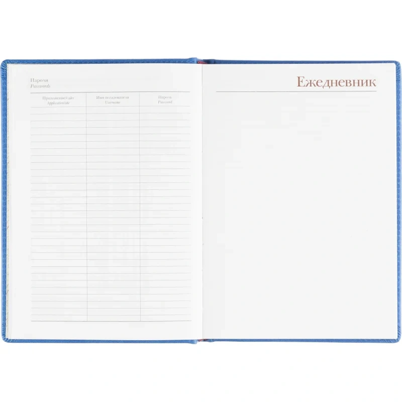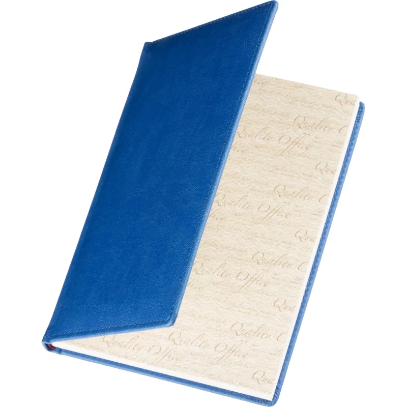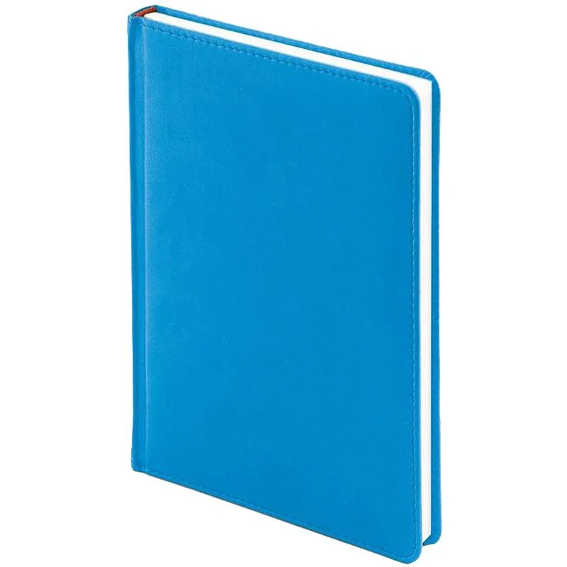 Ежедневник формата A5 с твёрдой обложкой синего цвета, выполненной из искусственной кожи, идеально подойдёт для работы в офисе. Внутренний блок состоит из 136 листов (272 страницы) белой офсетной бумаги плотностью 90 г/кв.м. с линейкой. Печать выполнена в два цвета.