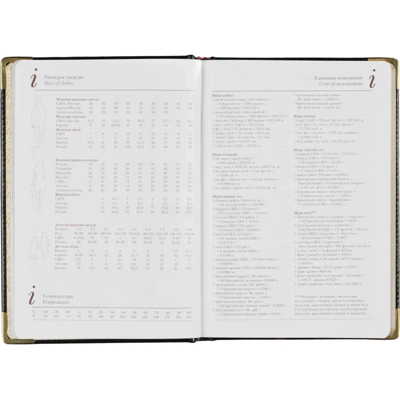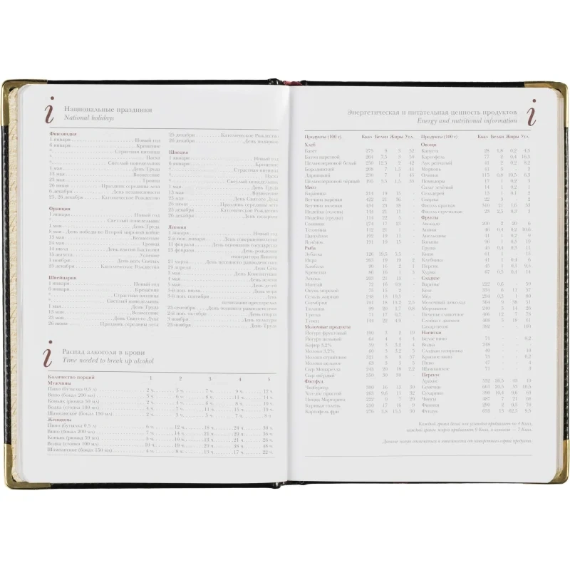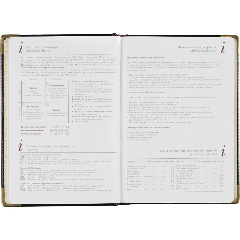 Внутренний блок состоит из 136 страниц белой офсетной бумаги с плотностью 90 г/кв.м., с линовкой в линейку. Каждая страница включает поле для записи времени с интервалом в 1 час. В начале ежедневника размещена полезная справочная информация, включая часовые пояса, телефонные коды, аэропорты Европы, религиозные праздники и другие важные данные.