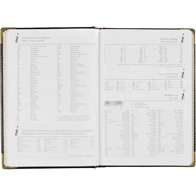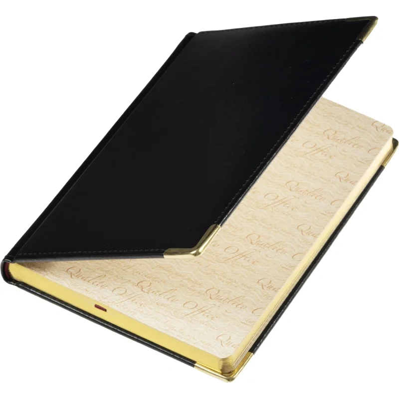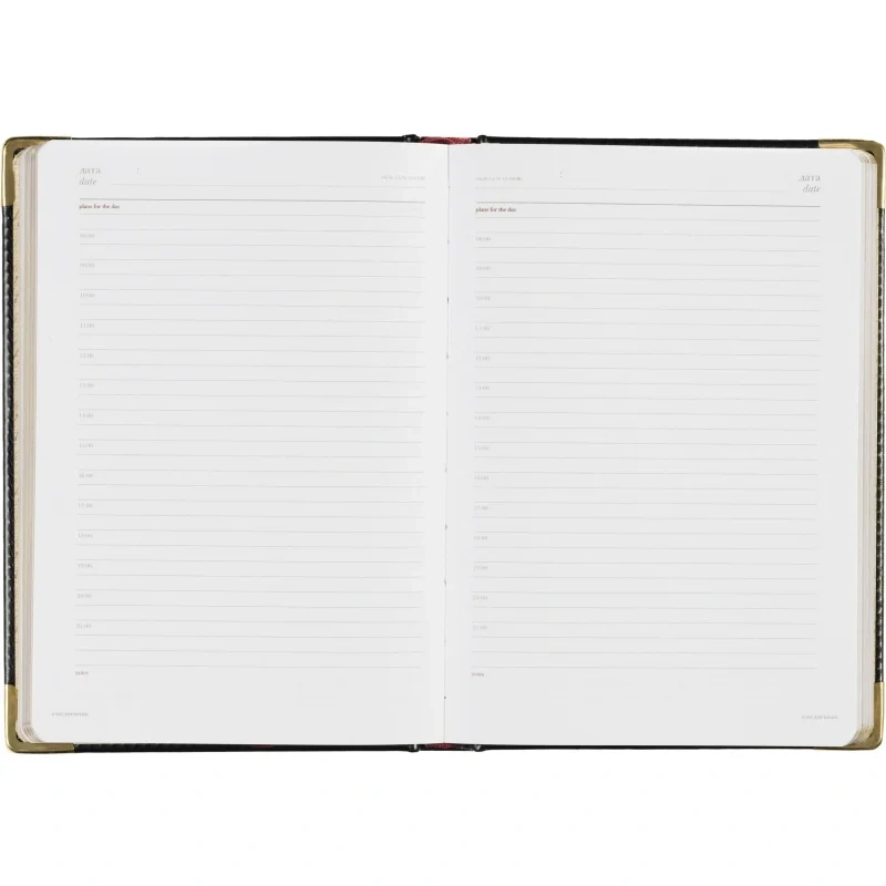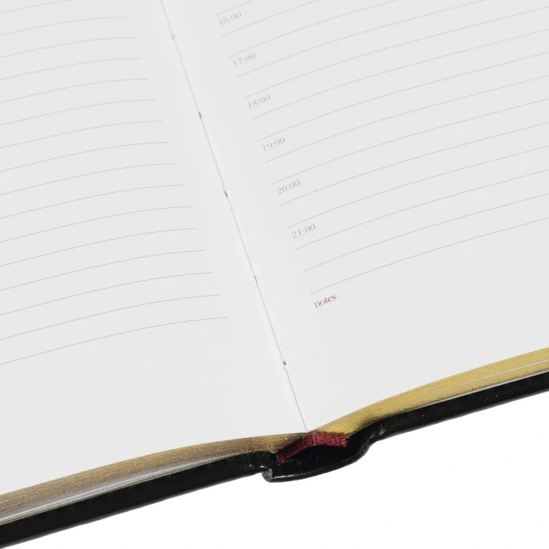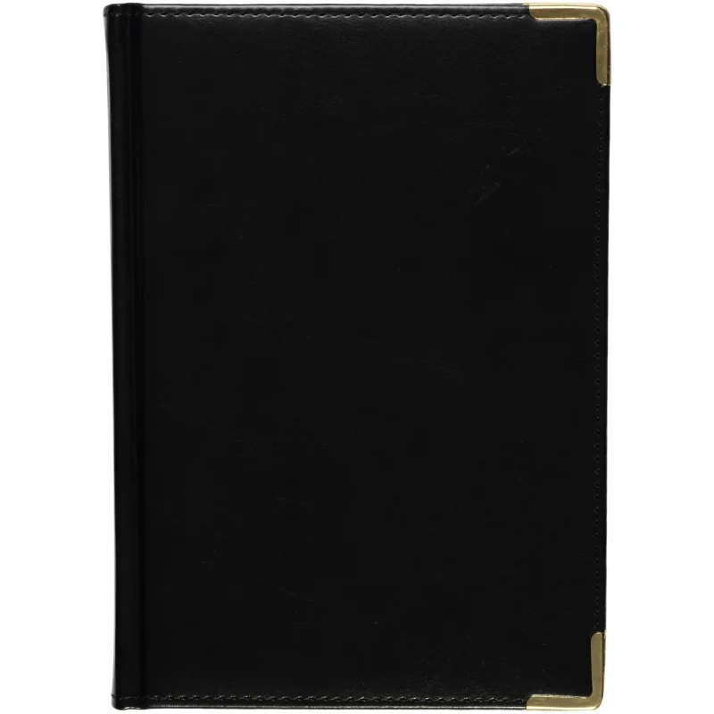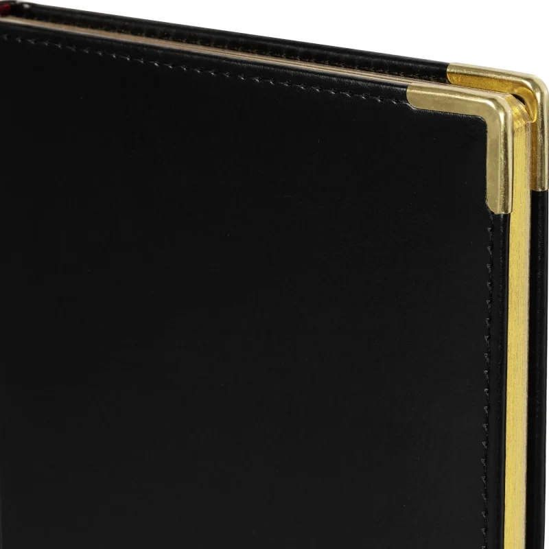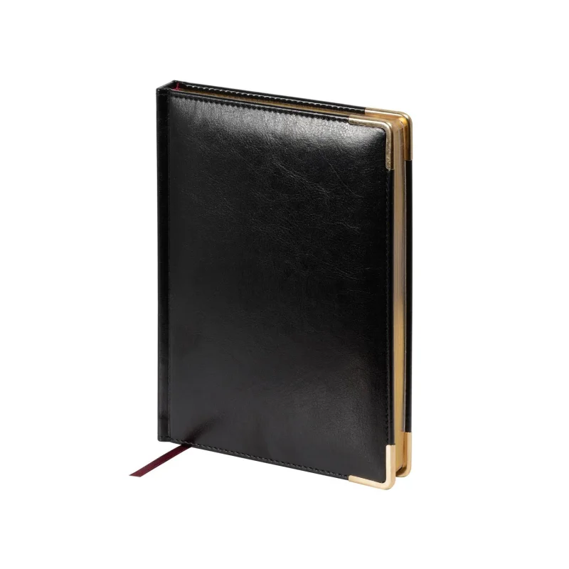 Этот недатированный ежедневник формата А5+ (14,5×20,5 см) с твёрдой обложкой из искусственной кожи, имитирующей натуральную кожу, сочетает стиль и практичность. Золотые уголки на обложке надёжно защищают блок от механических повреждений, придавая ему дополнительную элегантность. Прострочка по периметру и золотистый цветной обрез подчёркивают высокое качество изготовления.