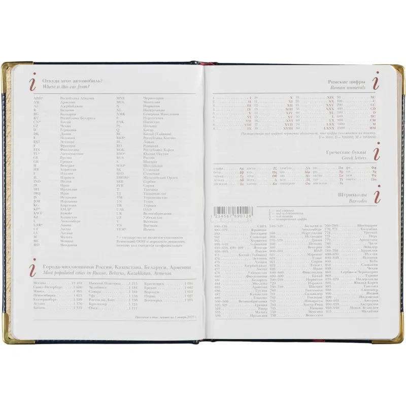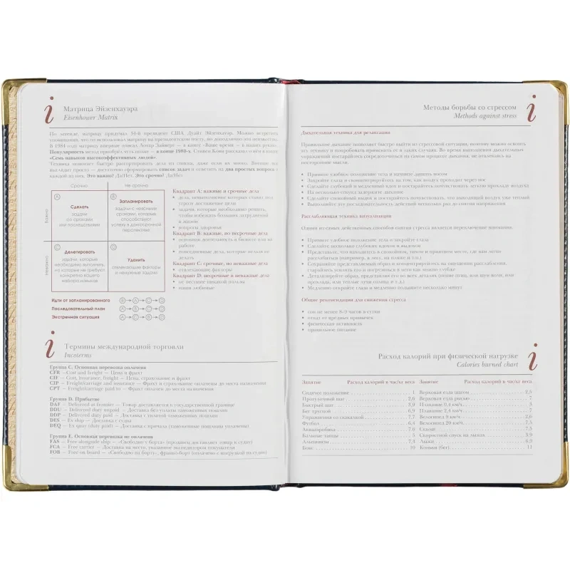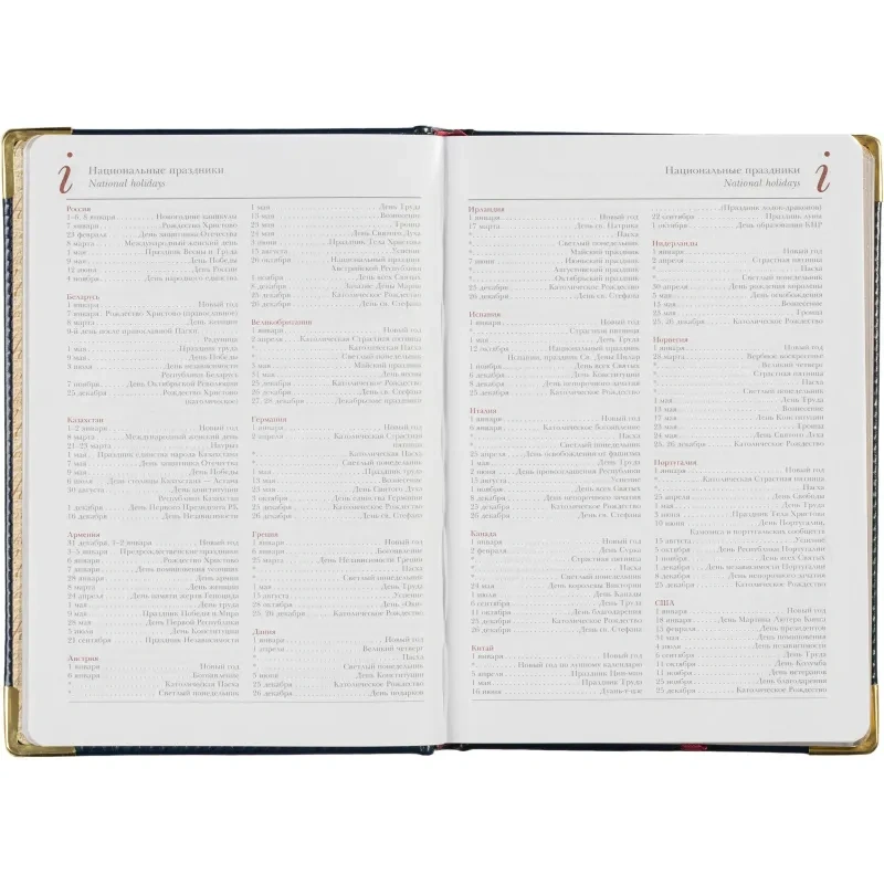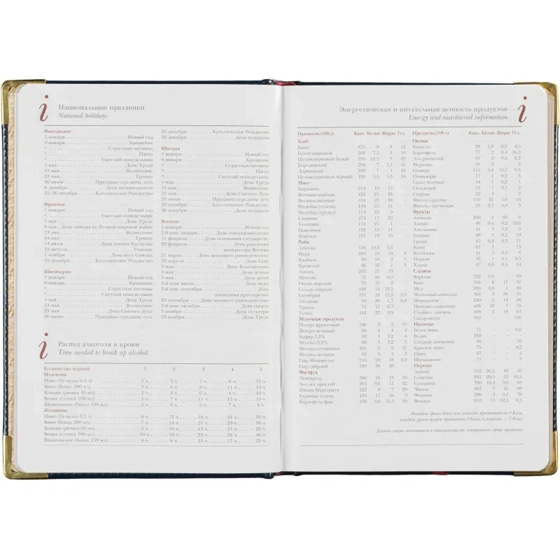 Внутри ежедневника размещена полезная справочная информация, включая часовые пояса, аэропорты Европы, телефонные коды, религиозные праздники, единицы измерения и другие важные данные. Плотность бумаги составляет 90 г/кв.м., а блок состоит из 136 страниц белой офсетной бумаги. Закладка-ляссе и цветной золотистый обрез дополняют его функциональность и стиль.