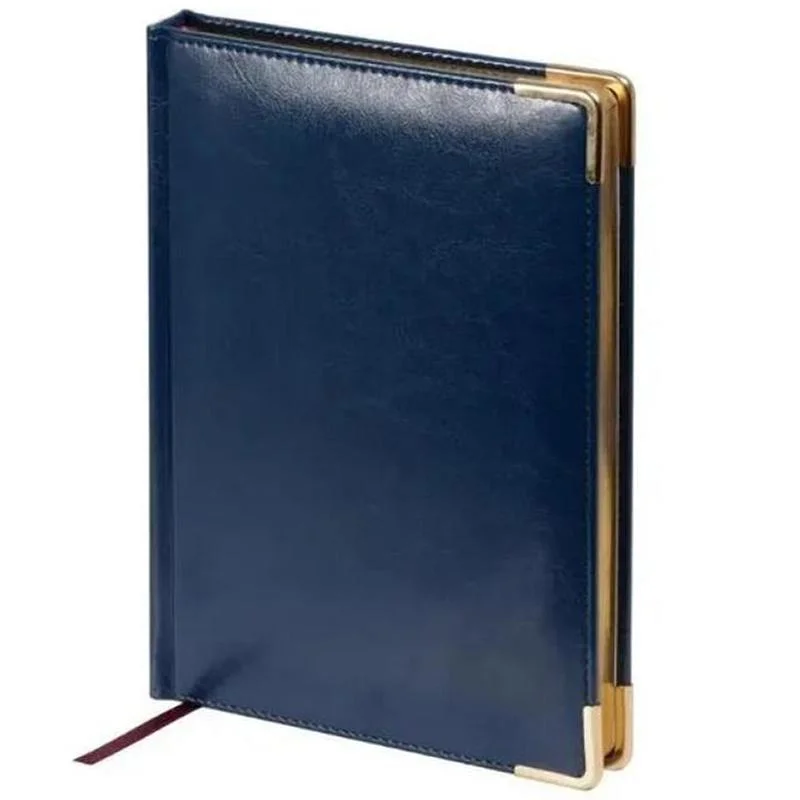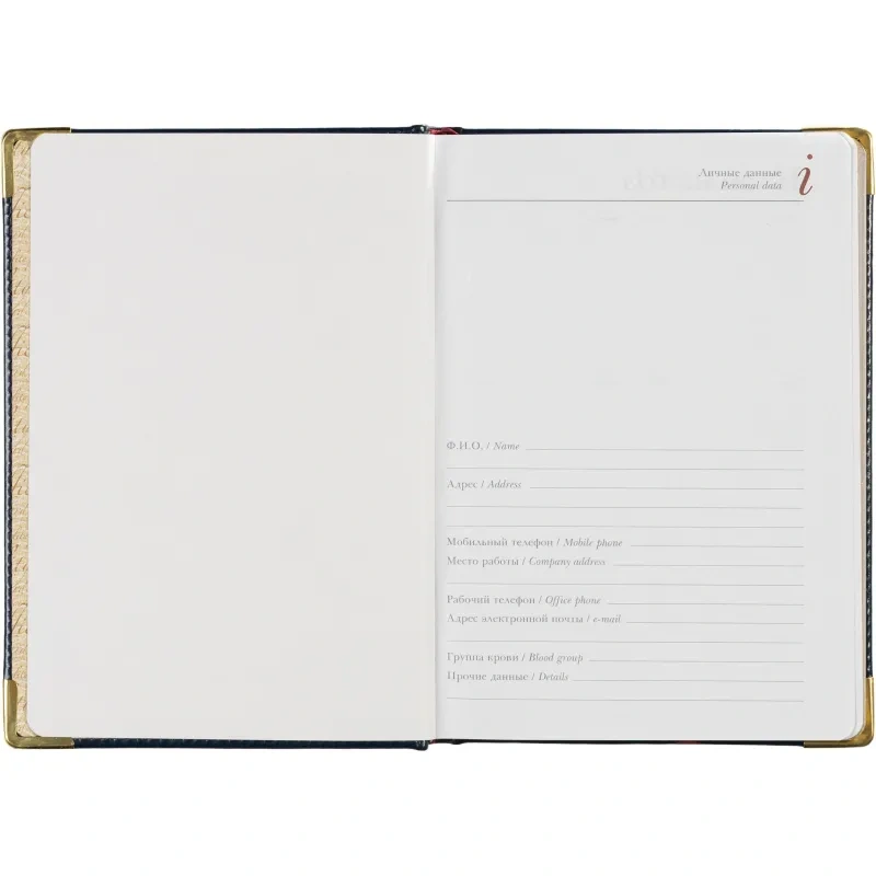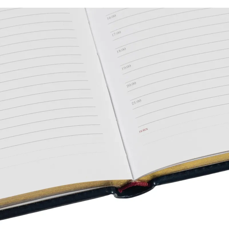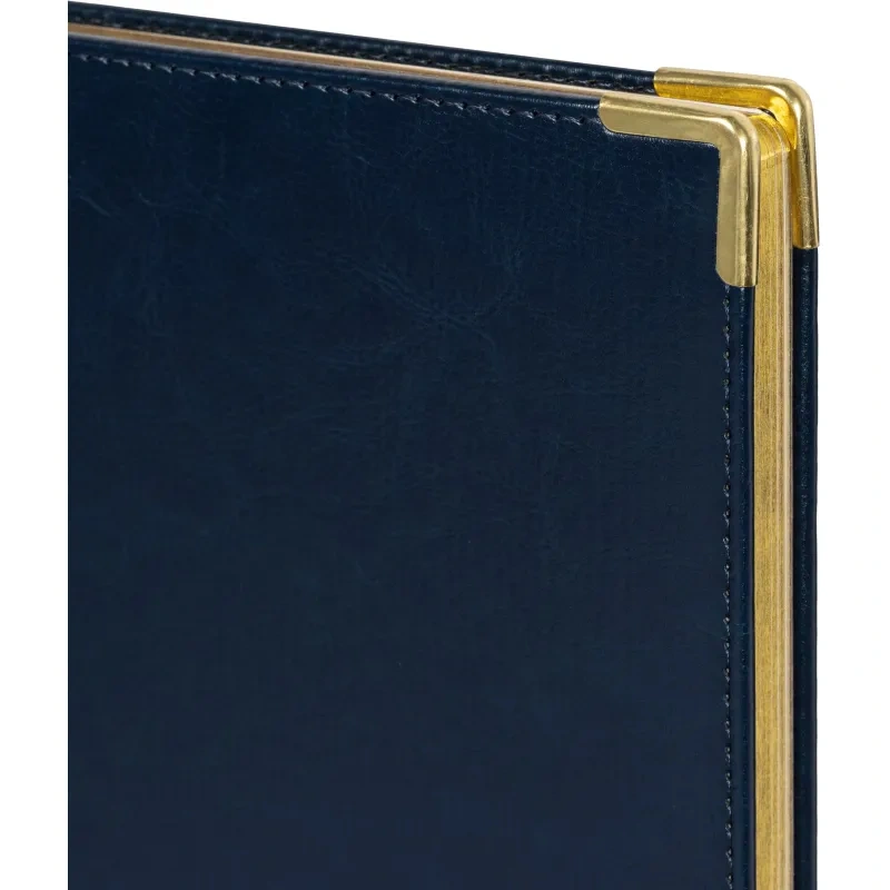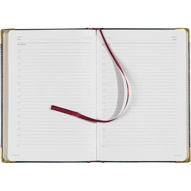 Этот недатированный ежедневник выполнен в формате А5+ (14,5×20,5 см) с жёсткой обложкой из искусственной кожи, максимально имитирующей фактуру натуральной кожи. Золотые уголки на обложке надёжно защищают блок от механических повреждений и добавляют элегантности. Удобная линовка в линейку с указанием времени суток помогает легко планировать рабочий день, а закладка-ляссе позволяет быстро найти последние записи.