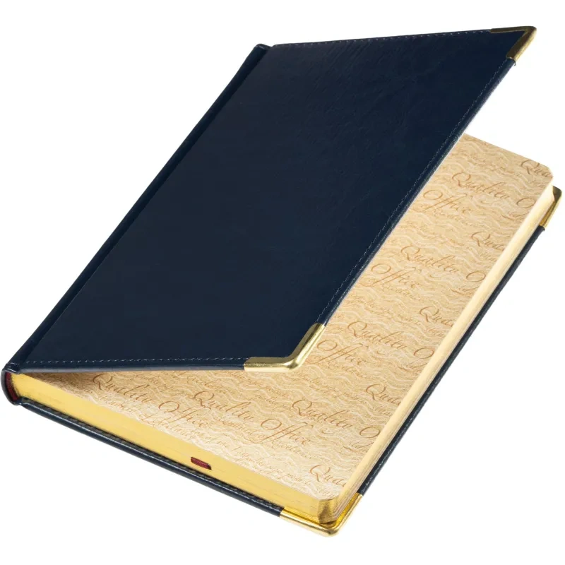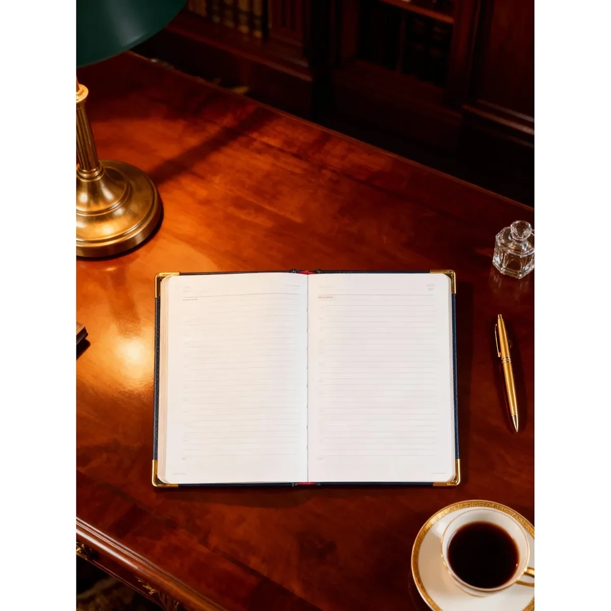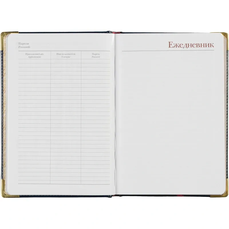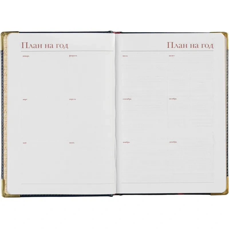 Этот недатированный ежедневник выполнен в формате А5+ (14,5×20,5 см) с жёсткой обложкой из искусственной кожи, максимально имитирующей фактуру натуральной кожи. Золотые уголки на обложке надёжно защищают блок от механических повреждений и добавляют элегантности. Удобная линовка в линейку с указанием времени суток помогает легко планировать рабочий день, а закладка-ляссе позволяет быстро найти последние записи.