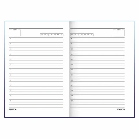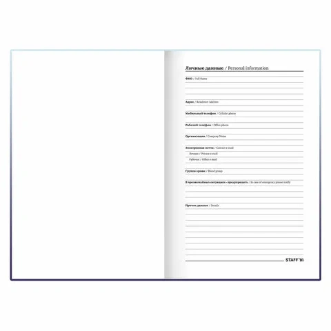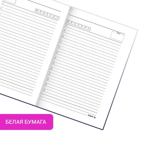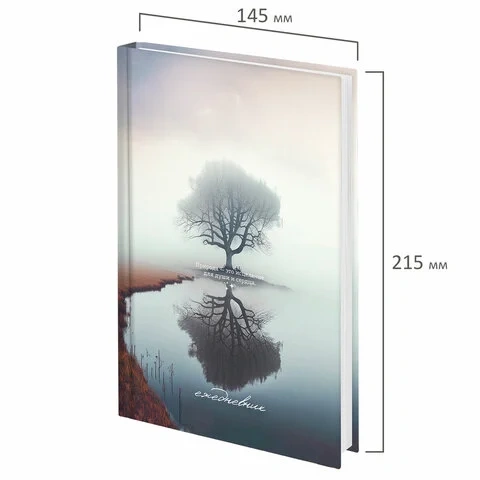 Внутренний блок включает 160 листов белой бумаги плотностью 65 г/м2. Благодаря стандартному формату А5 (145х215 мм) ежедневник удобно использовать как в офисе, так и на выездных деловых встречах. Твердая обложка покрыта матовой пленкой. Печать внутреннего блока выполнена в одну краску. В конце ежедневника есть 8 страниц для записей и заметок.