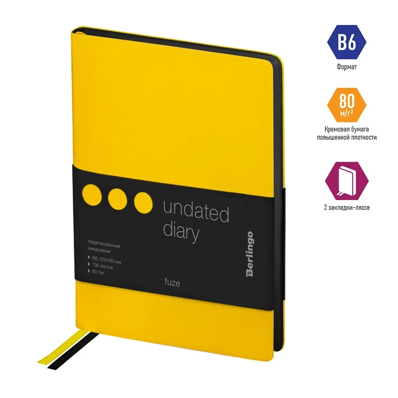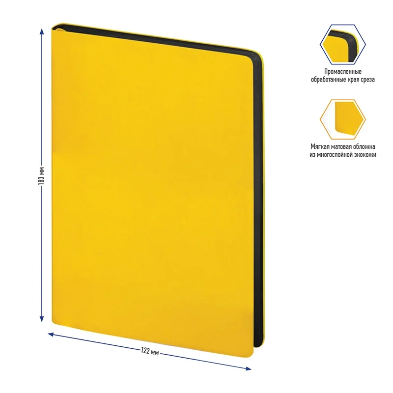 Внутренний блок включает 160 листов тонированной бумаги плотностью 70 г/м2. Каждая страничка имеет перфорированный угол. Благодаря стандартному формату А5 ежедневник удобно использовать как в офисе, так и на выездных деловых встречах. Интегральная обложка, стилизованная под гладкую кожу, фиксируется магнитным клапаном, поэтому ежедневник не откроется в сумке или портфеле и страницы не помнутся. Подходит для горячего тиснения. Срез и форзац ежедневника окрашены в цвет обложки, что придает ему особый шарм. Дополнением является закладка-ляссе, с помощью которой при необходимости можно быстро открыть ежедневник на нужной странице. Помимо прочего ежедневник снабжен обширным справочным материалом.
