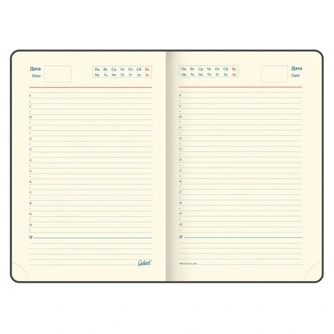 Внутренний блок включает 160 листов тонированной бумаги плотностью 70 г/м2. Каждая страничка имеет перфорированный угол. Благодаря стандартному формату А5 ежедневник удобно использовать как в офисе, так и на выездных деловых встречах. Интегральная обложка, стилизованная под гладкую кожу, фиксируется магнитным клапаном, поэтому ежедневник не откроется в сумке или портфеле и страницы не помнутся. Подходит для горячего тиснения. Срез и форзац ежедневника окрашены в цвет обложки, что придает ему особый шарм. Дополнением является закладка-ляссе, с помощью которой при необходимости можно быстро открыть ежедневник на нужной странице. Помимо прочего ежедневник снабжен обширным справочным материалом.