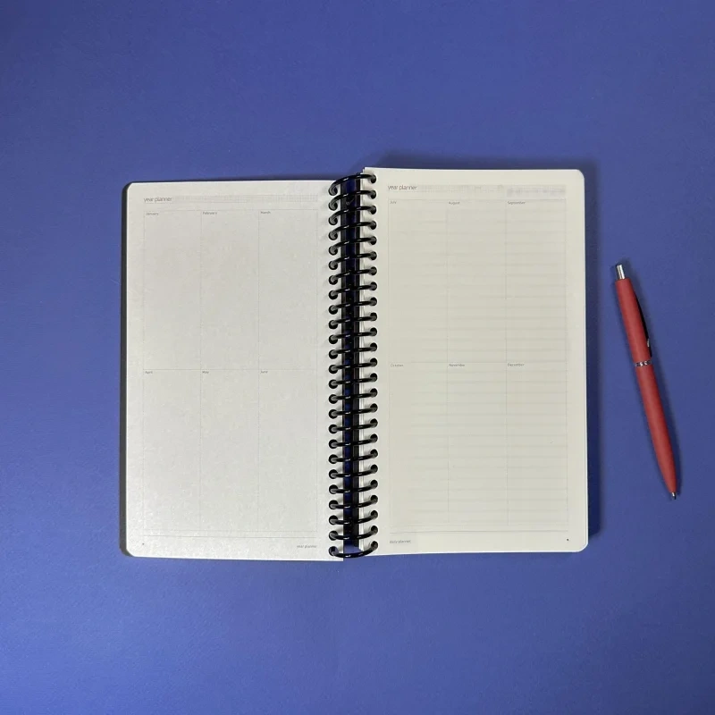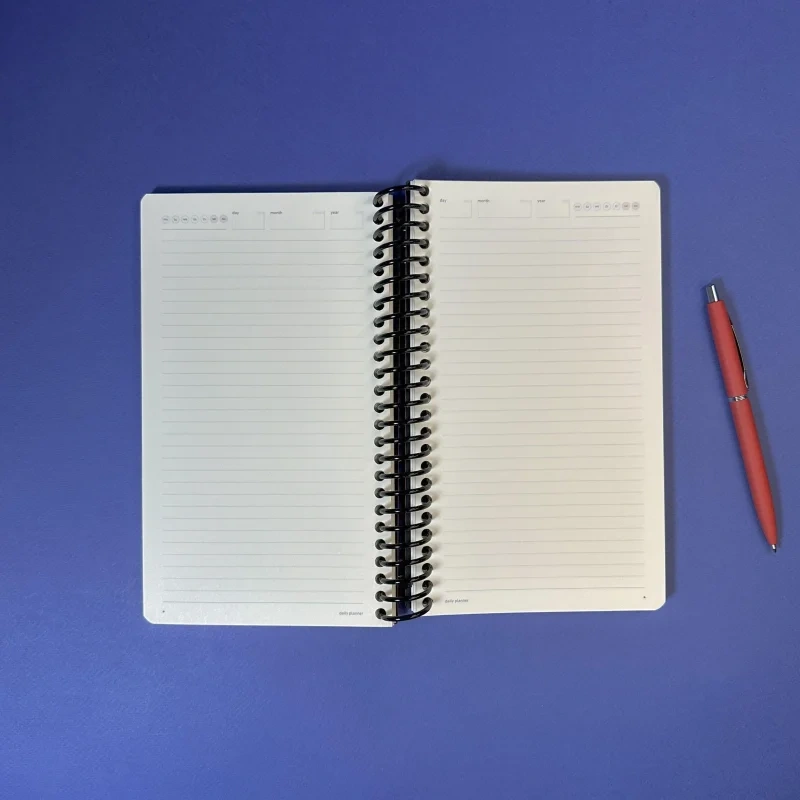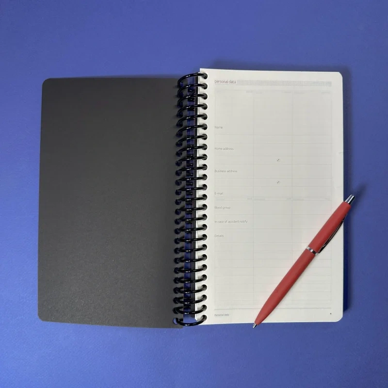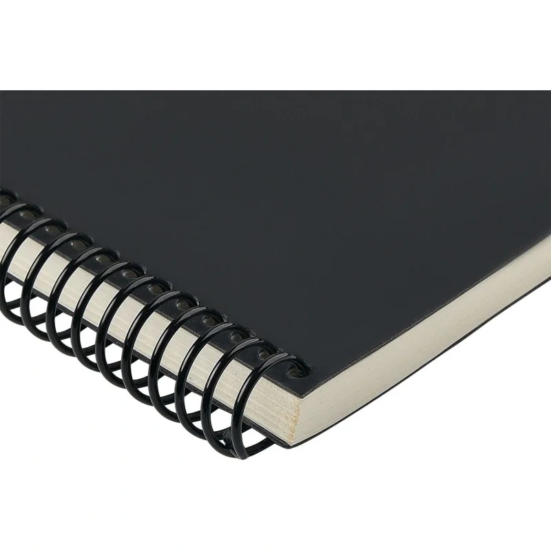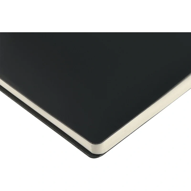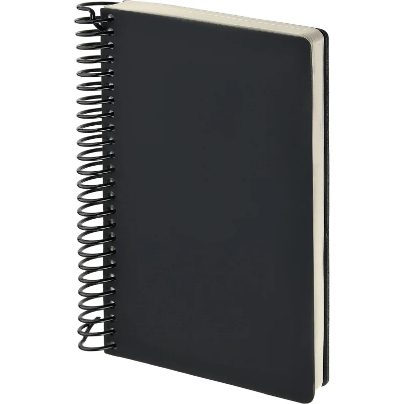 Недатированный ежедневник формата A5 с гибкой обложкой из чёрной искусственной кожи предназначен для повседневного планирования. Открытый гребень на спирали позволяет полностью раскрывать блок и удобно вести записи. Обложка оформлена в лаконичном однотонном стиле с покрытием Soft Touch. Внутренний блок выполнен из бежевой офсетной бумаги плотностью 80 г/кв.м, содержит страницы с линовкой, а также разделы для персональных данных и справочного материала (12 страниц). Углы скруглённые. Ежедневник поставляется в картонном ложементе.