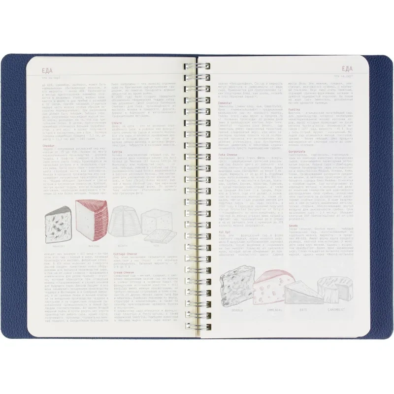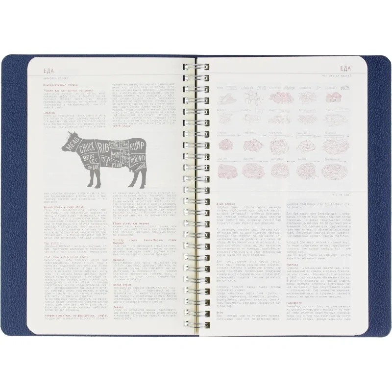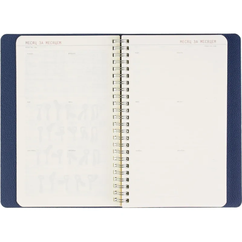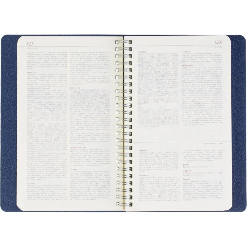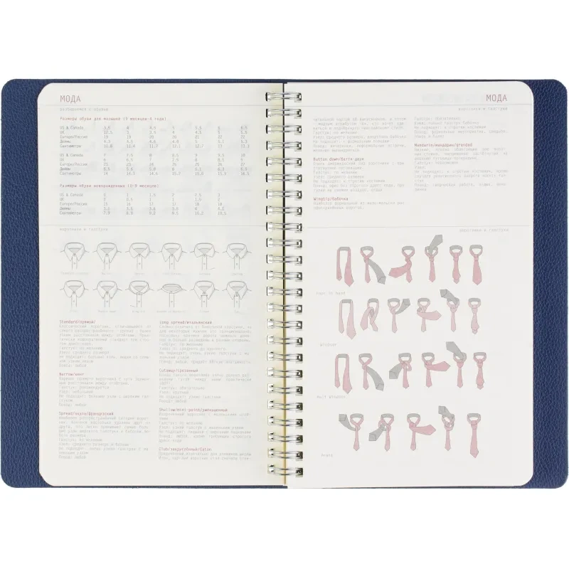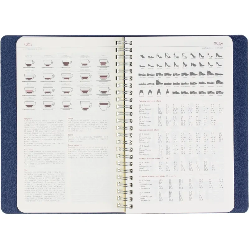 Внутри — офсетная бумага тонированного бежевого оттенка плотностью 70 г/кв.м с линовкой и печатью в две краски. Внутренний блок содержит 272 страницы, включая 19 страниц справочной информации. Удобный формат и прочное спиральное крепление делают ежедневник практичным инструментом для планирования. Упакован в подарочную коробку.
