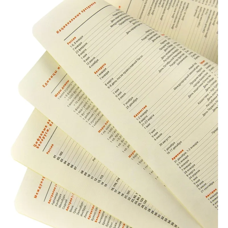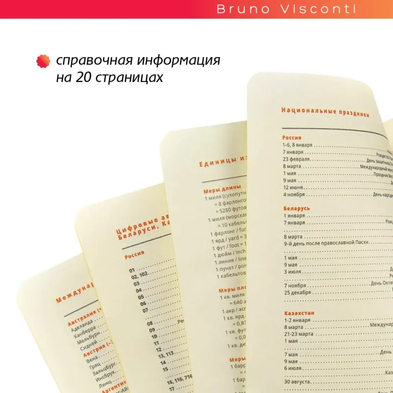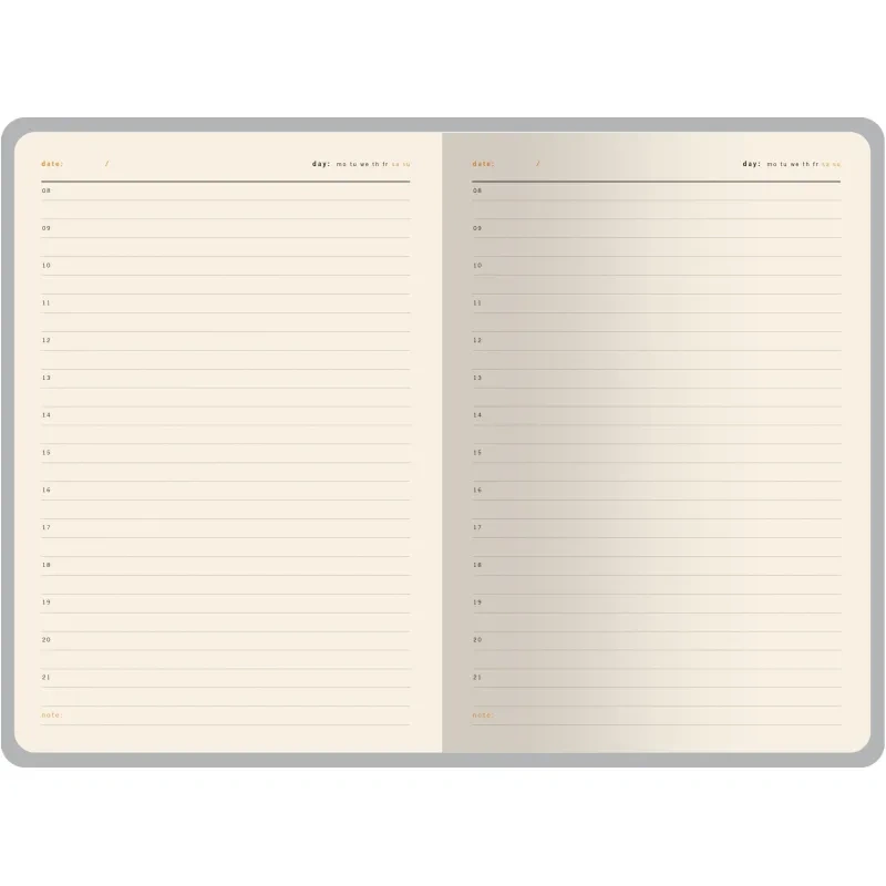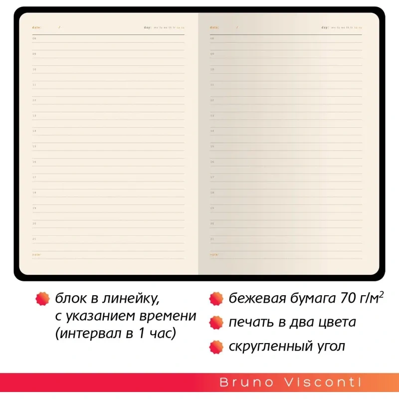 Внутренний блок содержит 136 страниц бежевой бумаги повышенной плотности и включает раздел для персональных данных, справочную информацию, а также блок для записей с линовкой и временными интервалами в один час. Дополнительная функциональность обеспечивается петлёй для держателя ручки. Этот ежедневник станет отличным выбором для эстетов и ценителей интересных и практичных решений.
