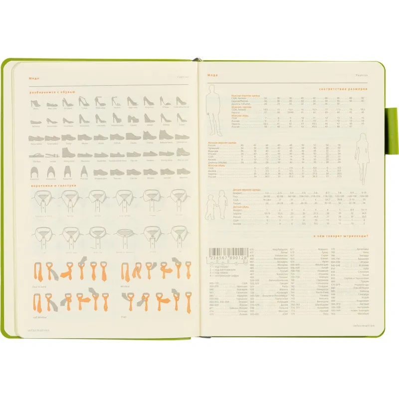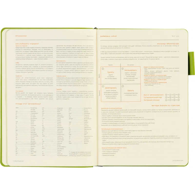 Внутренний блок состоит из 136 страниц тонированной офсетной бумаги плотностью 90 г/кв.м., с линовкой в линейку, что делает его удобным для записи. В ежедневнике есть раздел справочной информации на 21 странице, включающий полезные данные, такие как часовые пояса, телефонные коды, религиозные праздники, термины международной торговли и многое другое. Это добавляет функциональности и делает ежедневник удобным инструментом для работы и путешествий.