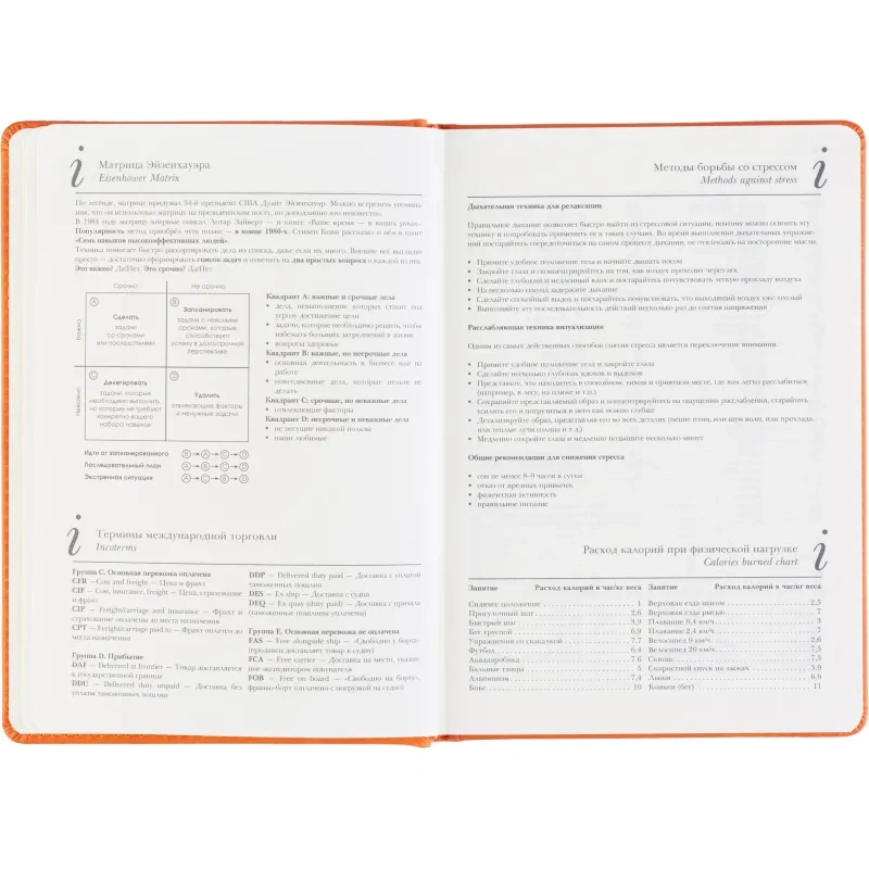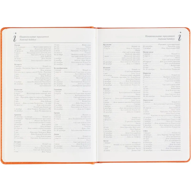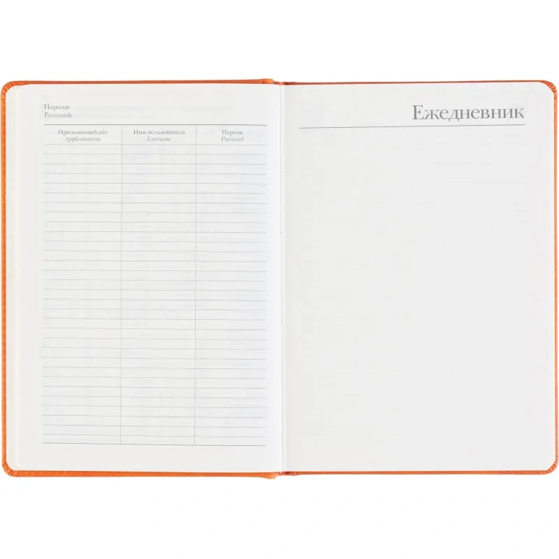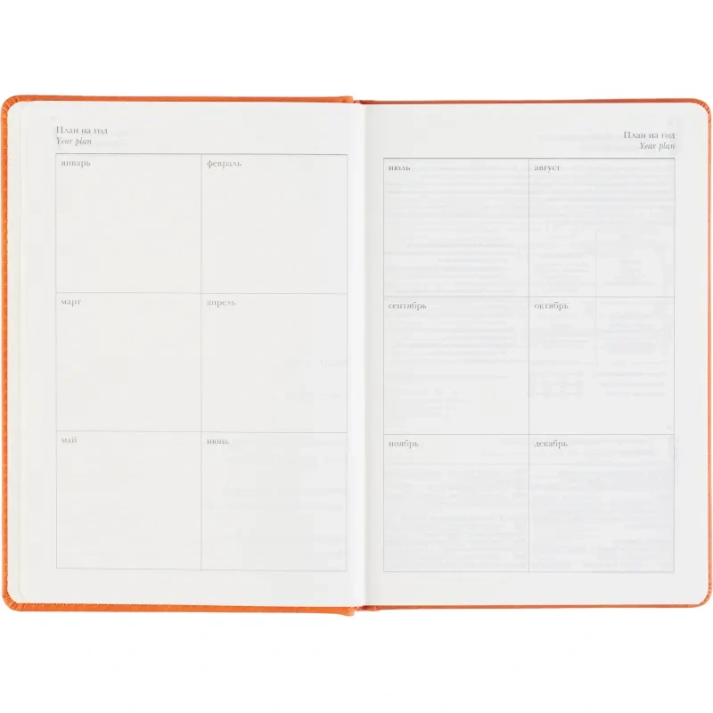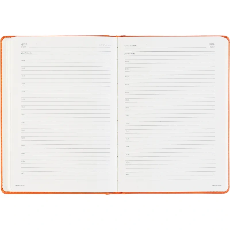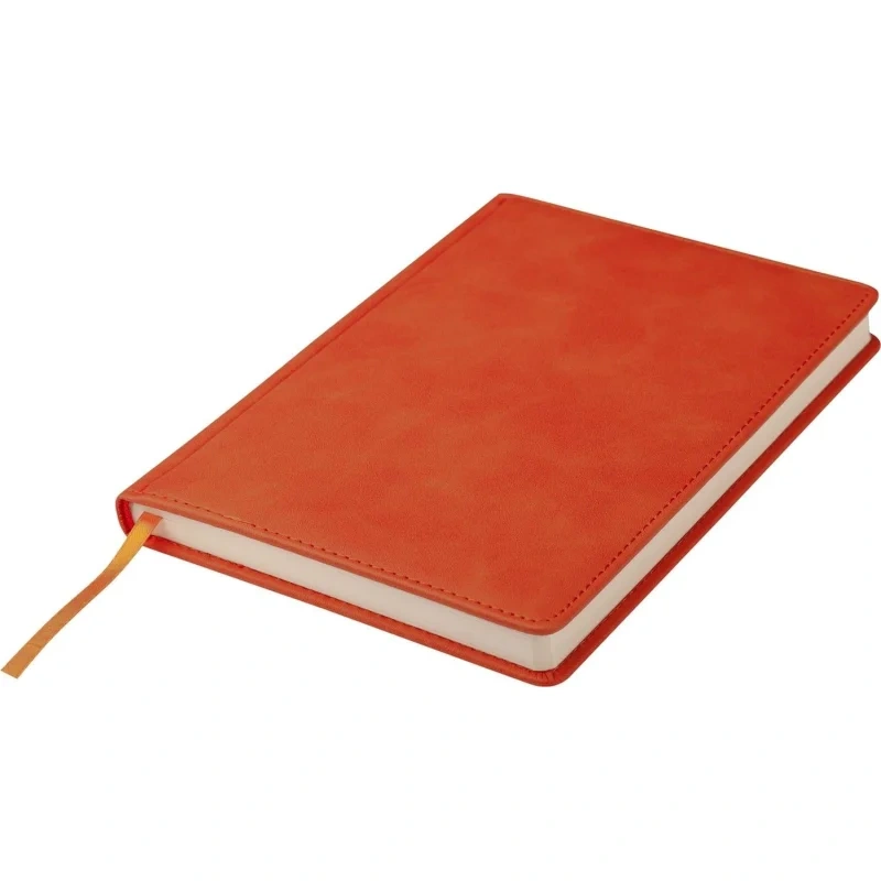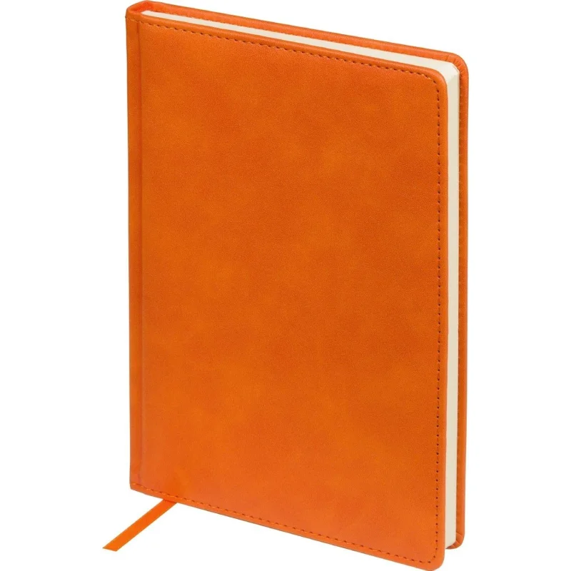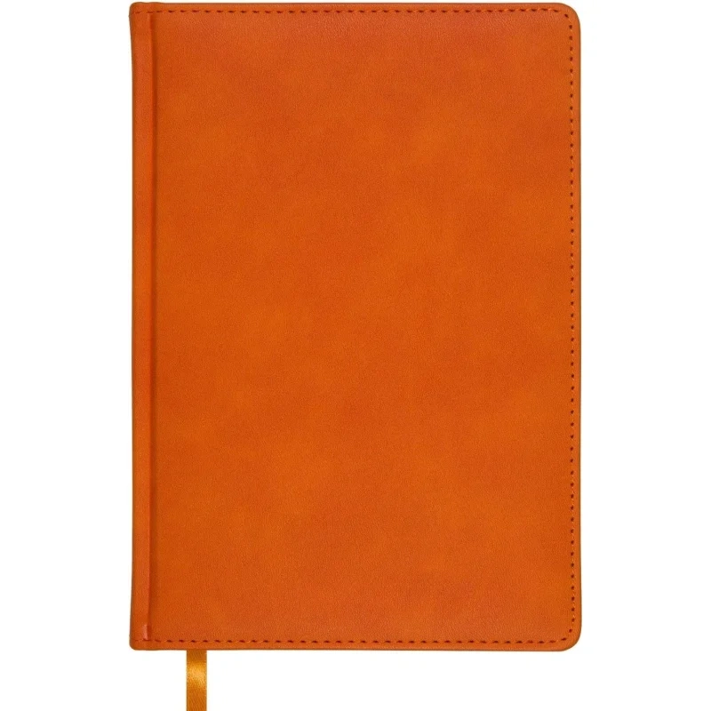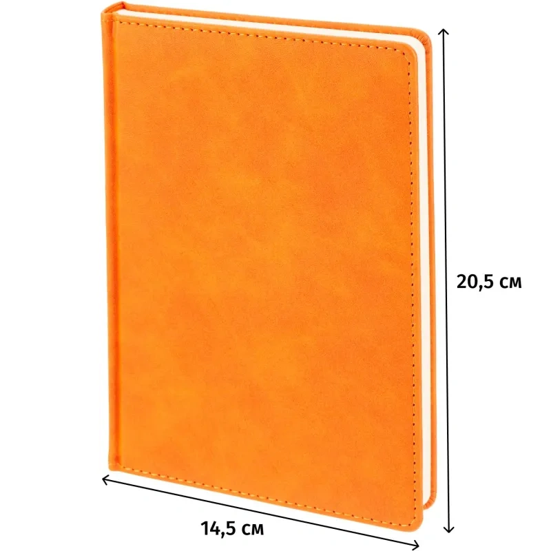 Недатированный ежедневник формата А5+ предназначен для планирования и ведения записей в деловом ритме. Обложка выполнена из фактурной искусственной кожи с декоративной прострочкой по периметру. Мягкая подложка из поролона придаёт ежедневнику комфортную тактильность. Яркий оранжевый цвет делает модель заметной среди офисных аксессуаров. Скруглённые углы дополняют аккуратный внешний вид. Внутренний блок включает 128 листов тонированной бежевой бумаги плотностью 70 г/кв.м. Печать выполнена в одну краску, страницы имеют линовку. Блок сшит, дополнен ляссе в цвет обложки.