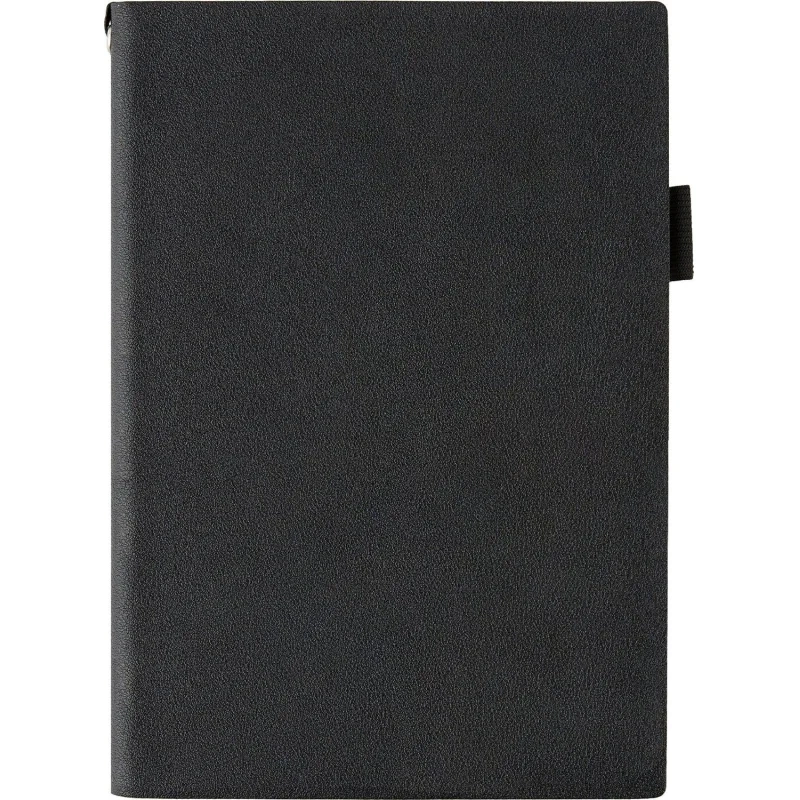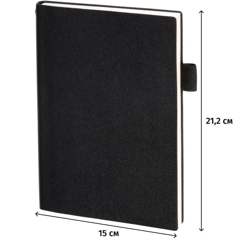 Недатированный ежедневник формата А5 выполнен в мягкой гибкой обложке из чёрной искусственной кожи. Модель оснащена двойным ляссе, зафиксированным на корешке нестандартным способом, а также петлёй под ручку. Внутренний блок включает 128 листов бежевой офсетной бумаги плотностью 80 г/кв.м с линовкой и печатью в одну краску. В начале содержатся страницы для справочной информации на 14 листах. Переплёт выполнен на сшивке. Ежедневник подойдёт для тех, кто ценит функциональность и внимание к деталям.
