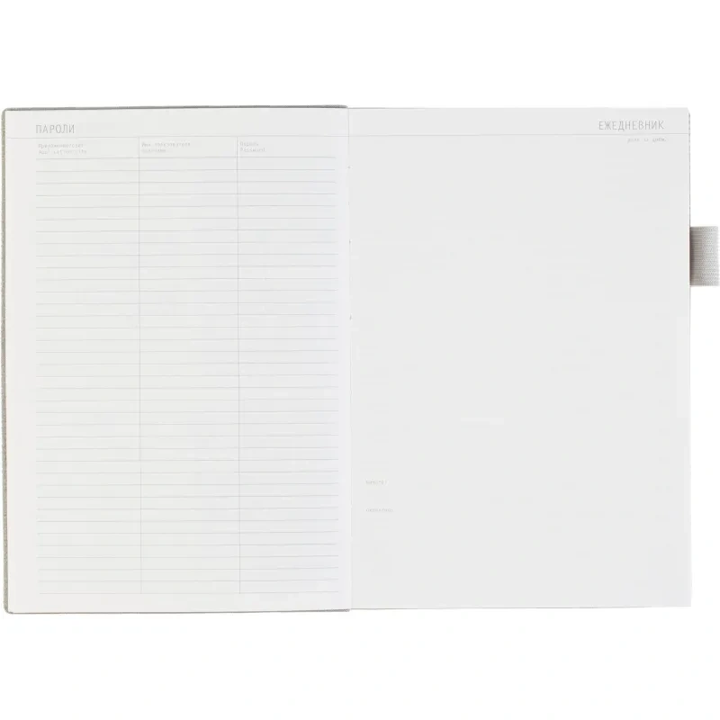 Недатированный ежедневник формата А5 выполнен в мягкой гибкой обложке из искусственной кожи. Модель оснащена петлёй под ручку и двойным ляссе, зафиксированным на корешке. Внутренний блок включает 128 листов офсетной бежевой бумаги плотностью 80 г/кв.м с линовкой и печатью в одну краску. В начале размещены 14 страниц справочной информации. Ежедневник прошит, не имеет скруглённых углов и подходит для персонализации.