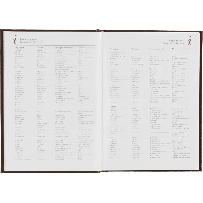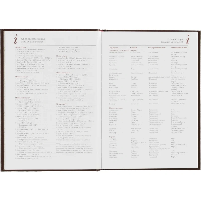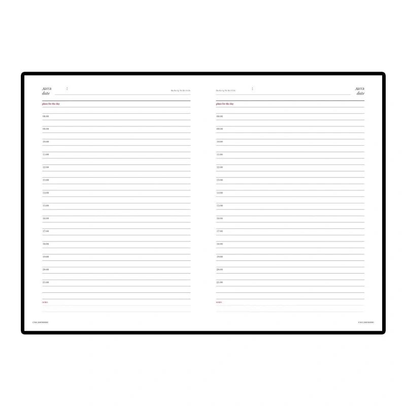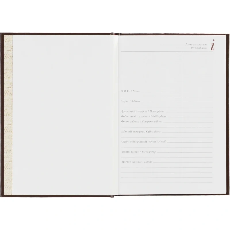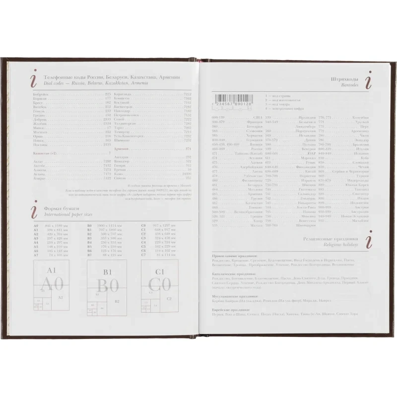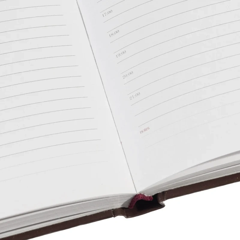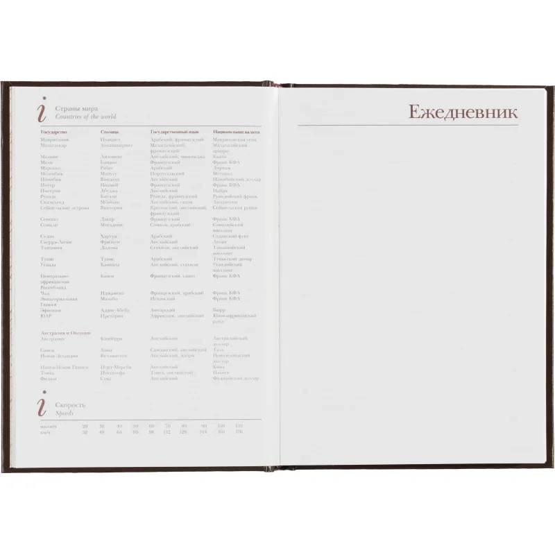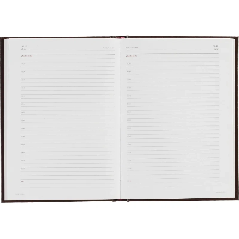 Ежедневник формата А5+ (14,5×20,5 см) включает 136 страниц белой офсетной бумаги плотностью 90 г/кв.м. Страницы разбиты по часам, с двумя строками для записи на каждый час, а также дополнительными строками для планов на день и заметок. В начале ежедневника присутствует справочная информация, включая часовые пояса, телефонные коды, аэропорты, религиозные праздники и другие полезные данные. Телефонная книга также входит в комплект.
