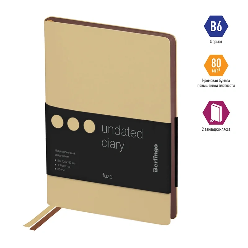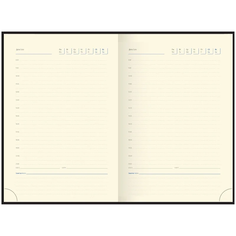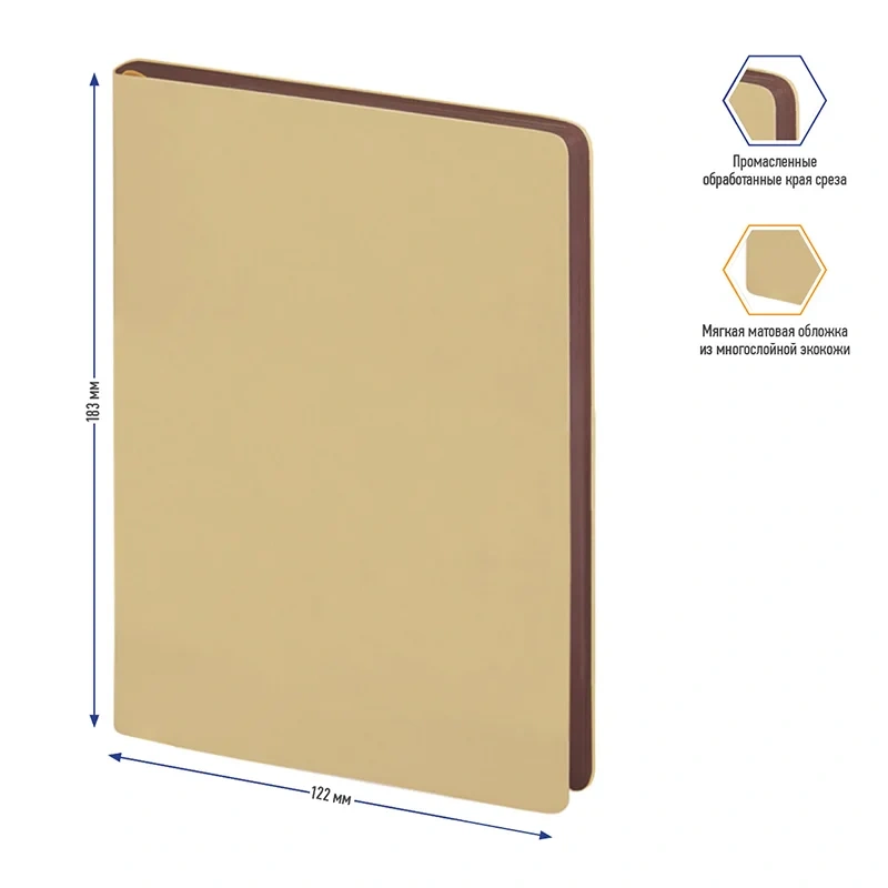Внутренний блок, состоящий из 272 страниц бежевой бумаги плотностью 70 г/кв.м, оформлен с линовкой в линейку и с удобными элементами навигации: ляссе и перфорированными уголками для быстрого поиска нужной страницы. Этот ежедневник идеально подходит для деловых людей и может быть персонализирован.