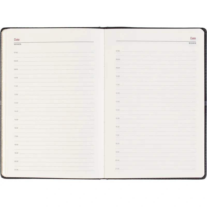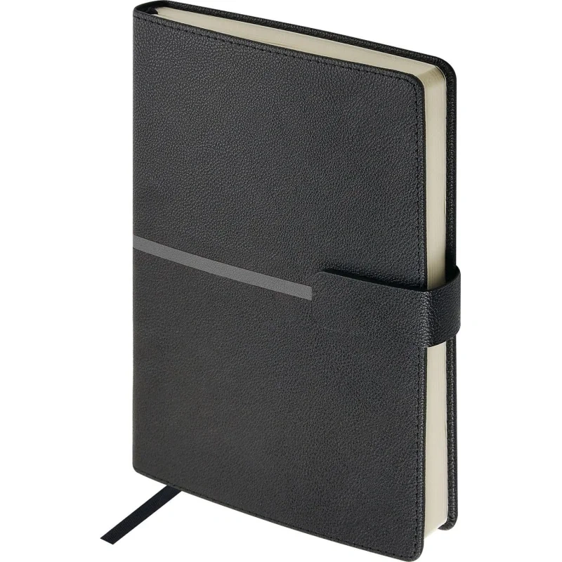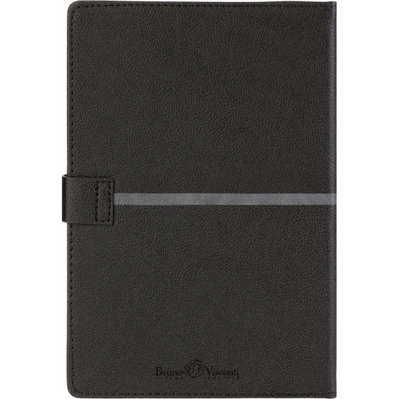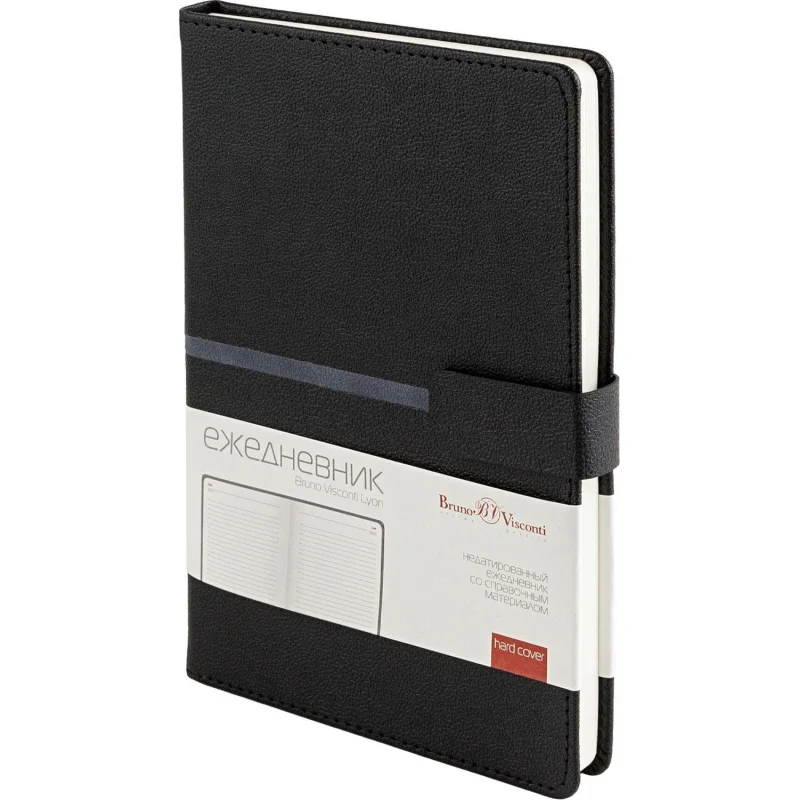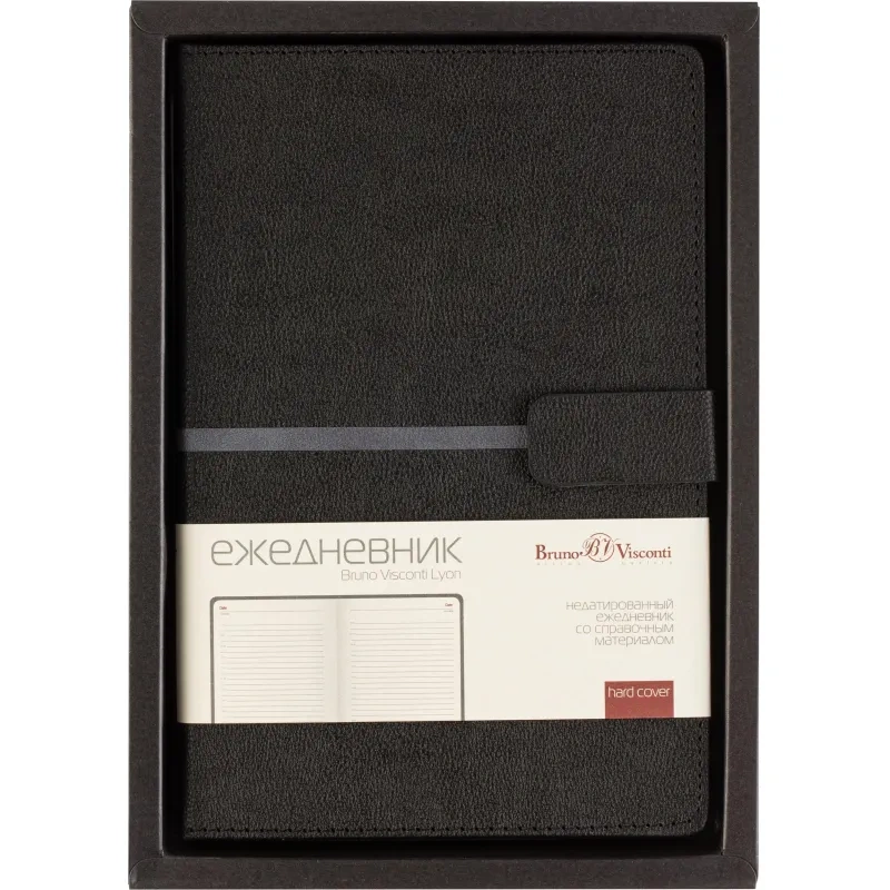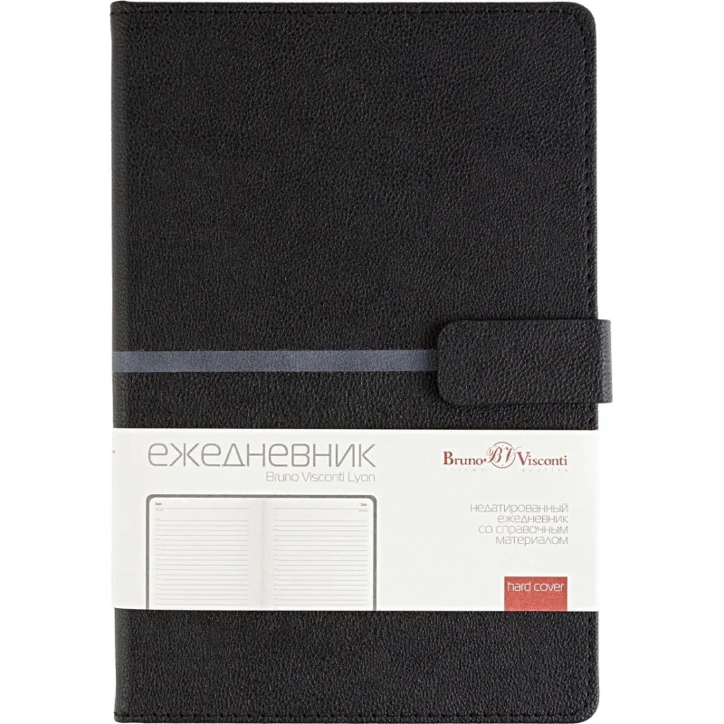 Ежедневник недатированный Bruno Visconti Lyon формата A5 выполнен в твёрдой чёрной обложке из искусственной кожи с декоративной строчкой по периметру. Классический сшивной переплёт дополнен магнитным хлястиком и ляссе в цвет обложки. Внутренний блок содержит 272 страницы тонированной офсетной бумаги плотностью 70 г/кв.м с линовкой и печатью в две краски. В структуру включены страницы для персональных данных, планирования по месяцам и записи задач по времени с шагом один час. Также предусмотрено 9 страниц справочной информации. Модель подходит под персонализацию и поставляется в подарочной упаковке.