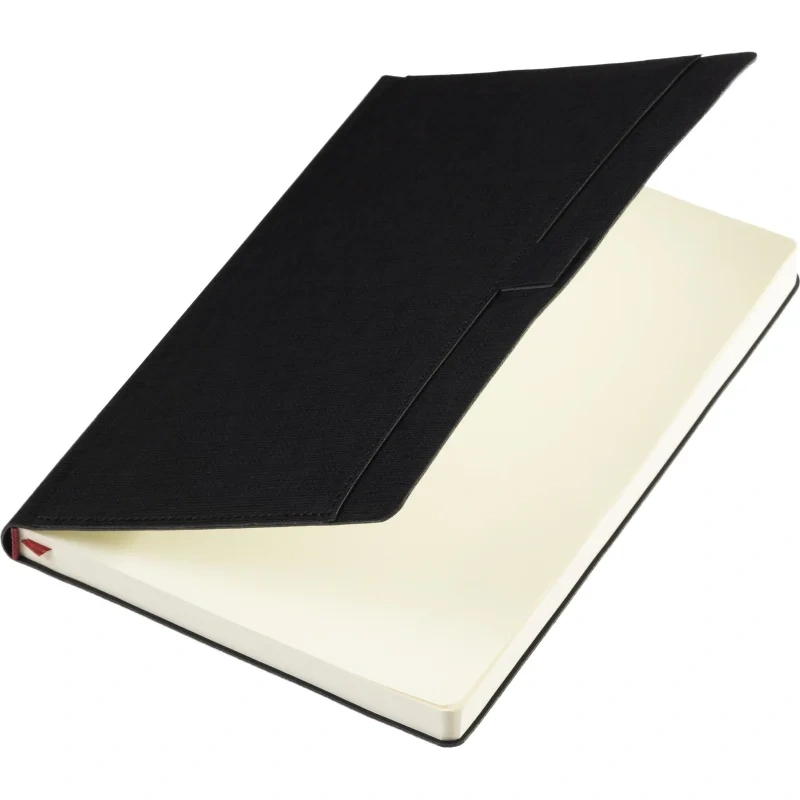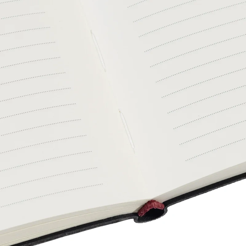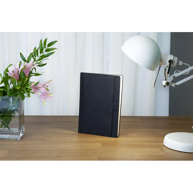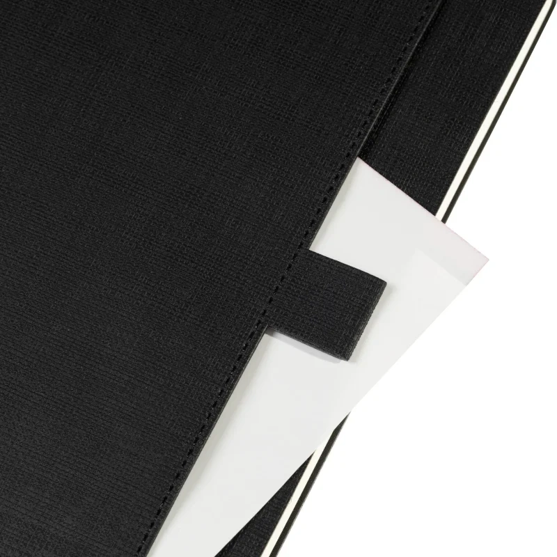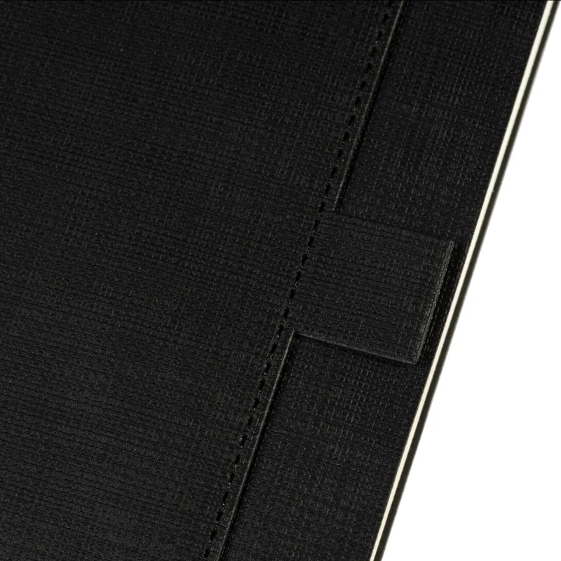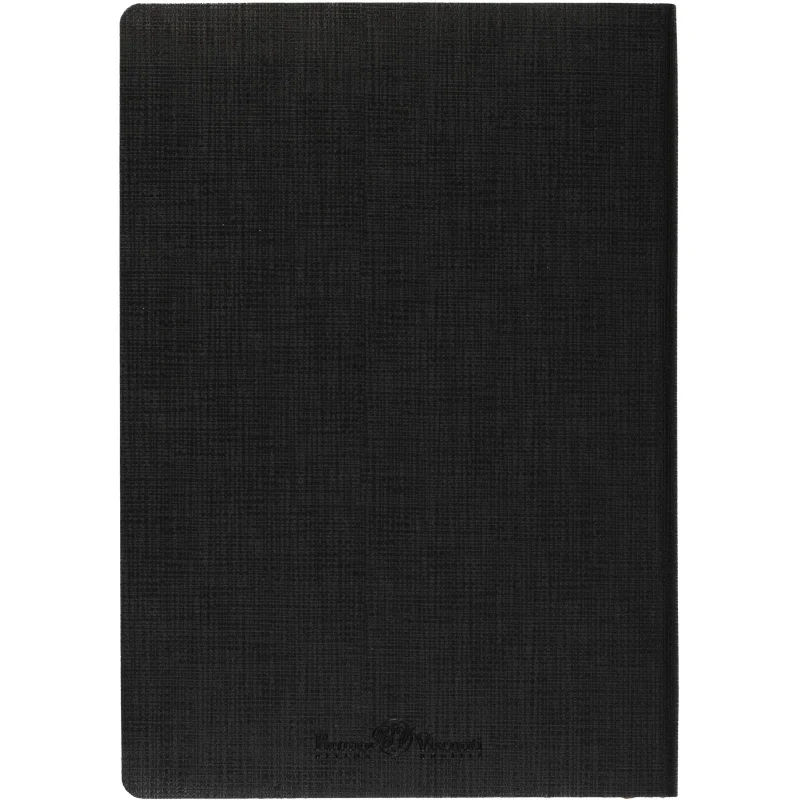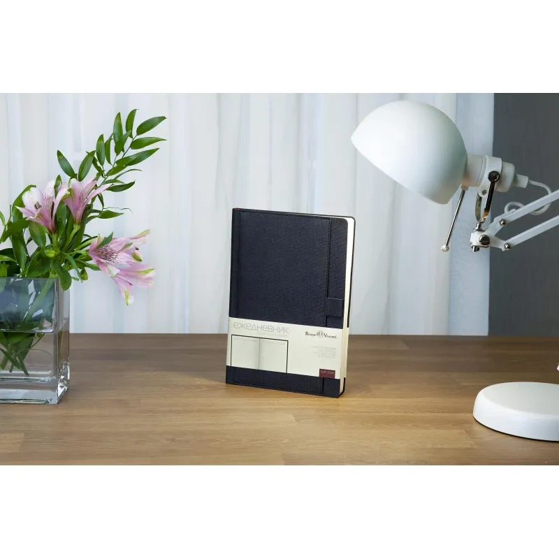 Ежедневник формата А5 выполнен из искусственной кожи чёрного цвета, с мягкой обложкой и сшивкой, что придаёт ему стильный и лаконичный внешний вид. Дополнительный функционал обложки включает карман для бумаг и петлю для ручки, что повышает удобство использования в повседневной жизни. Внутренний блок состоит из 136 страниц тонированной бумаги плотностью 70-90 г/кв.м. с линовкой в линейку для записи.