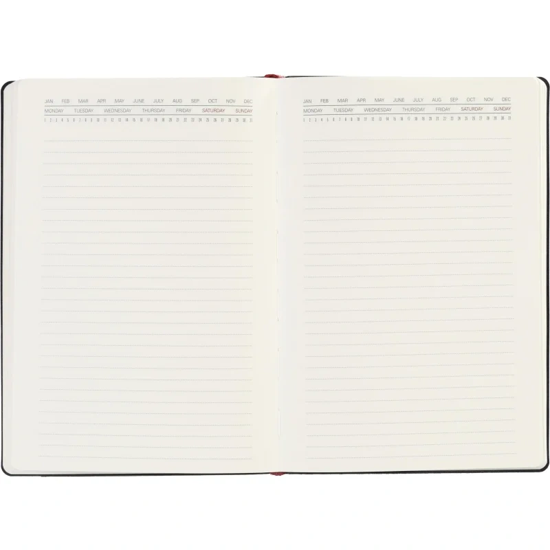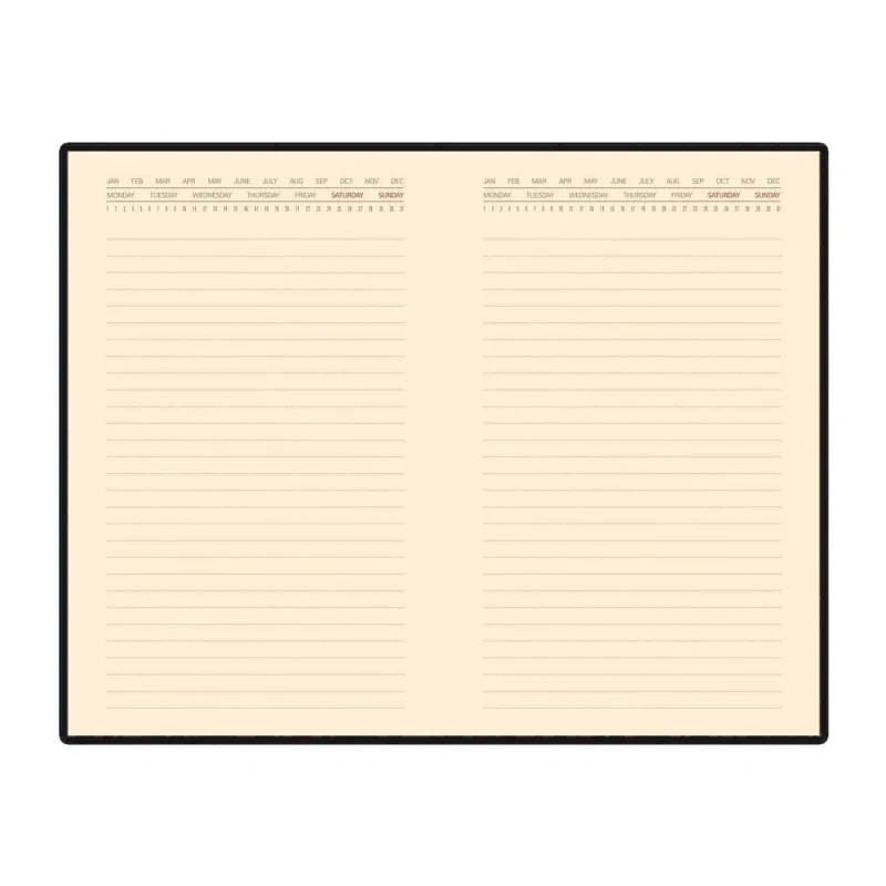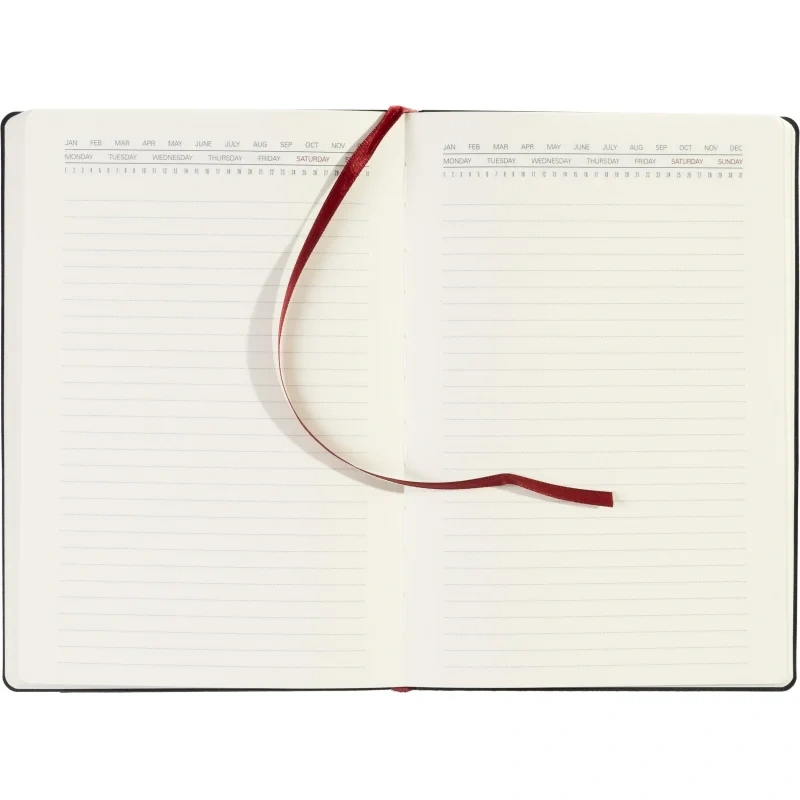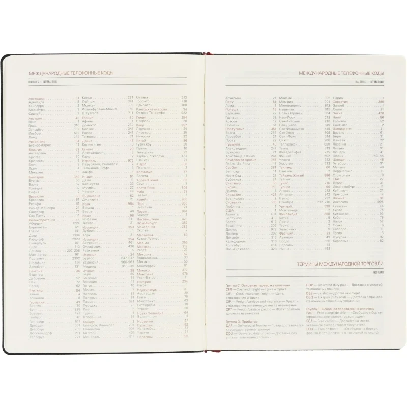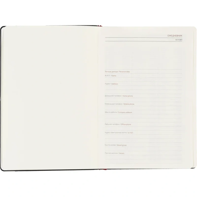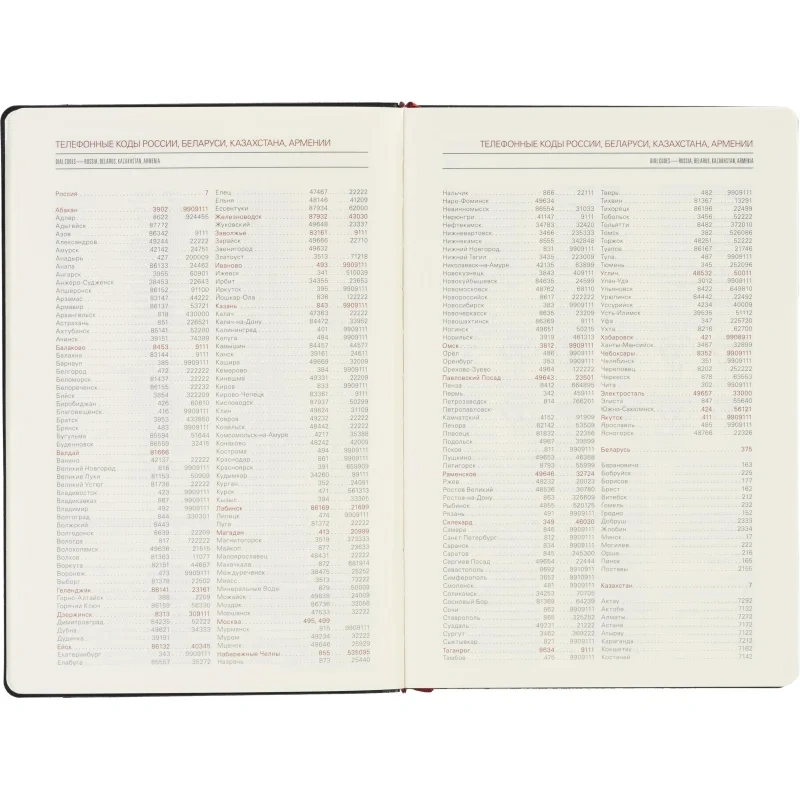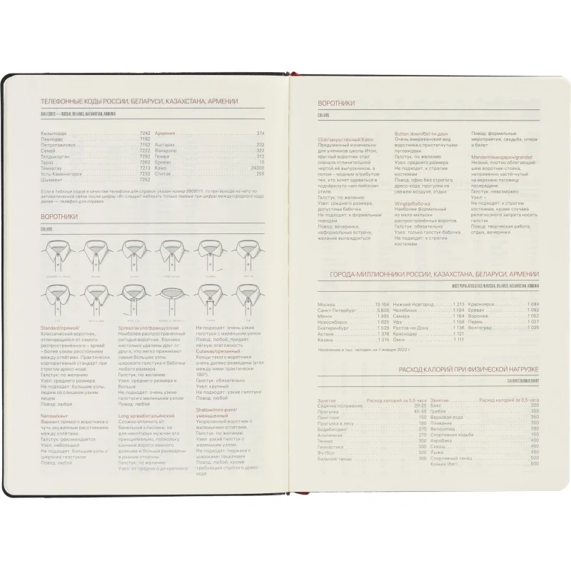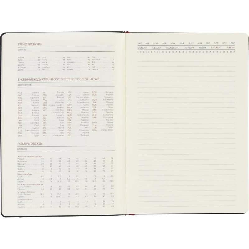 Ежедневник также включает раздел со справочной информацией, охватывающей такие важные темы, как часовые пояса, телефонные коды, размеры одежды, расход калорий и другие полезные данные. В конце есть страничка для личной информации. Этот ежедневник прекрасно подойдёт для деловых людей и может быть персонализирован.