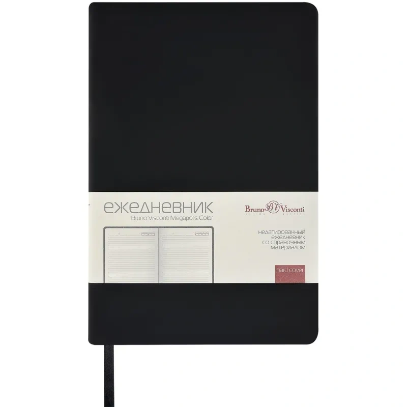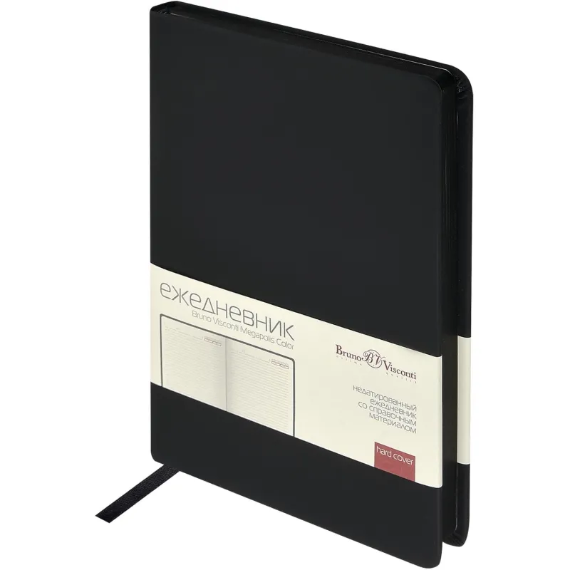 Ежедневник недатированный Bruno Visconti Megapolis color формата A5 — это стильный и практичный аксессуар для планирования рабочего времени и ведения деловых записей. Твёрдая обложка из искусственной кожи с Soft Touch покрытием придаёт ежедневнику элегантность и тактильное удовольствие. Однотонный чёрный цвет обложки в офисном стиле и обрез, выполненный в цвет обложки.