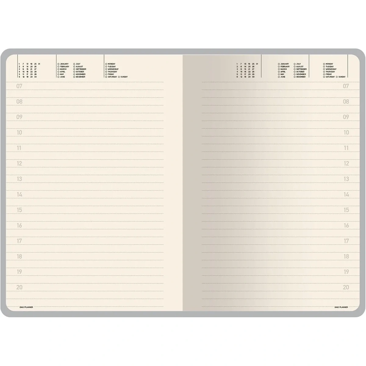 Внутренний блок состоит из 272 страниц бежевой бумаги плотностью 70 г/кв.м, с линовкой в линейку для удобства записи. Недатированные страницы имеют выделенные места для проставления числа месяца и дня недели.