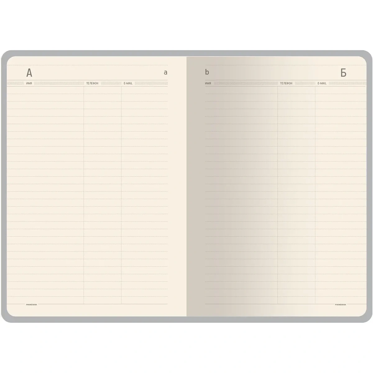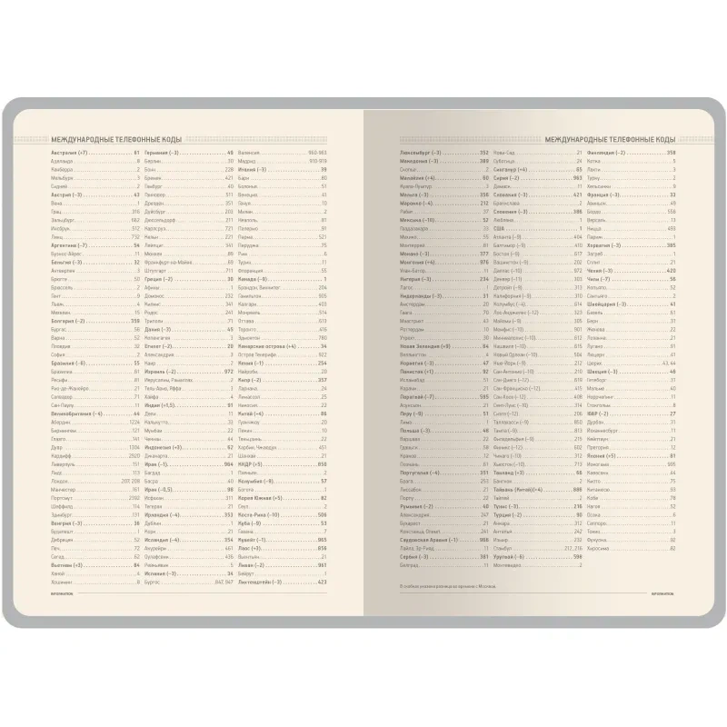 Внутреннее пространство организовано с максимальной функциональностью. На 136 листах тонированной офсетной бумаги плотностью 70 г/кв.м, размещены удобные страницы для планирования с часовой разлиновкой, место для персональных данных, а также обширный справочный раздел. Здесь собрана вся необходимая информация: от кодов аэропортов Европы и международных телефонных кодов до таблиц мер и весов, данных о странах мира и календаря праздников. Отдельные страницы выделены под телефонную книгу для важных контактов.