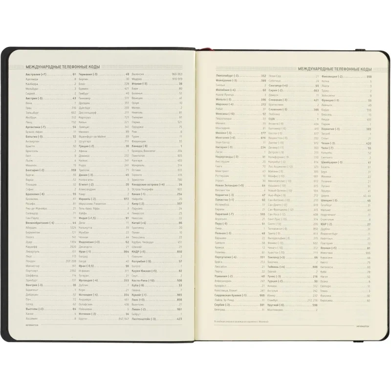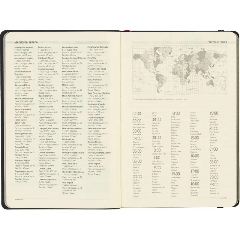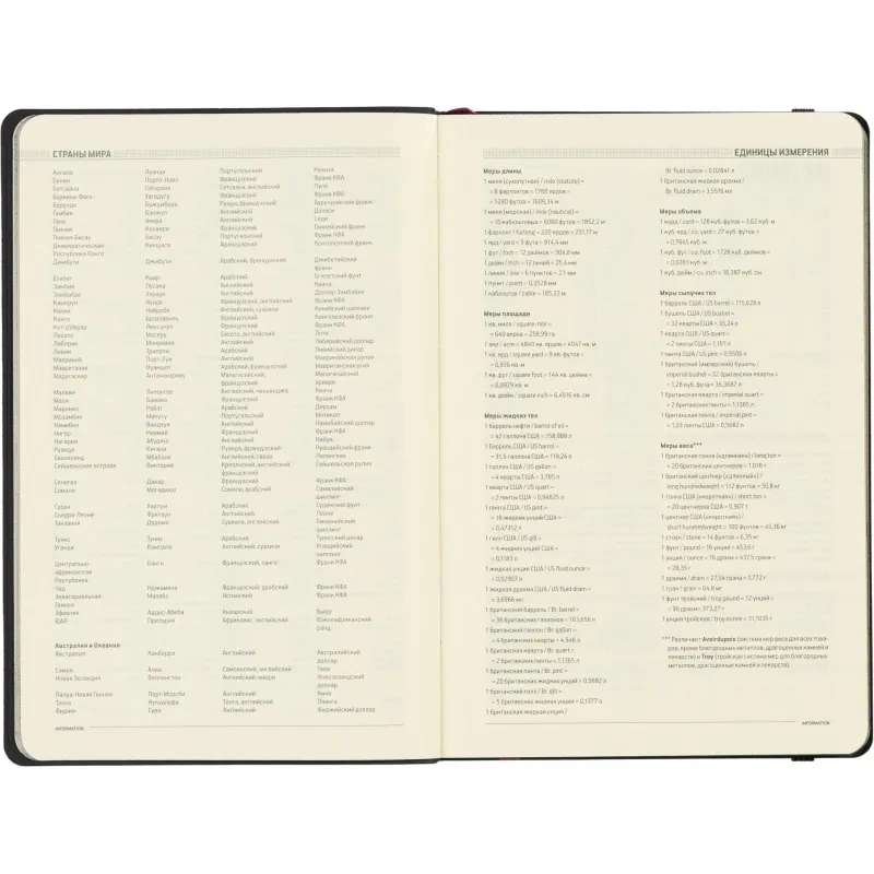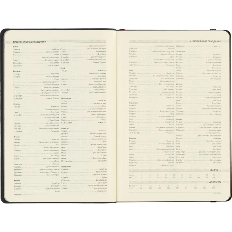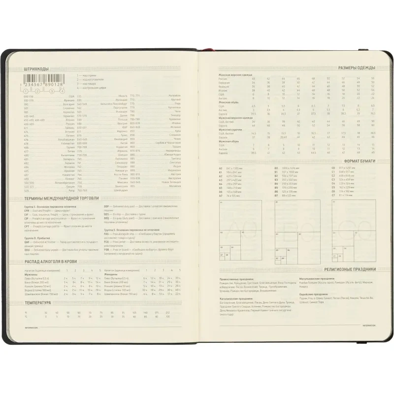 Ежедневник содержит 136 страниц тонированной офсетной бумаги плотностью 90 г/кв.м. с линейкой, подходящей для записи и заметок. Листы могут быть использованы с любого дня, так как в них предусмотрено поле для указания даты. На 18 страницах размещена справочная информация, охватывающая широкий спектр данных, включая часовые пояса, телефонные коды, религиозные праздники, единицы измерения, термины международной торговли, распад алкоголя в крови и многие другие полезные сведения.