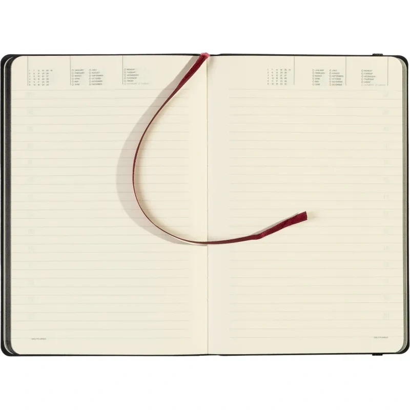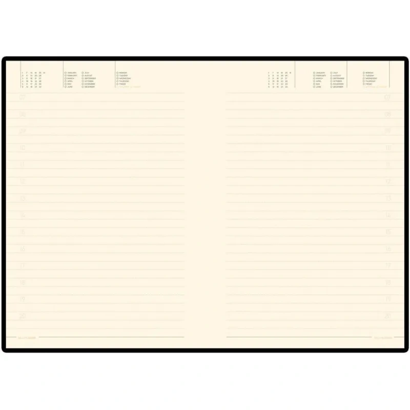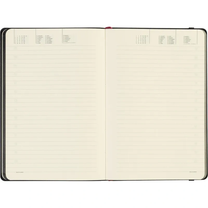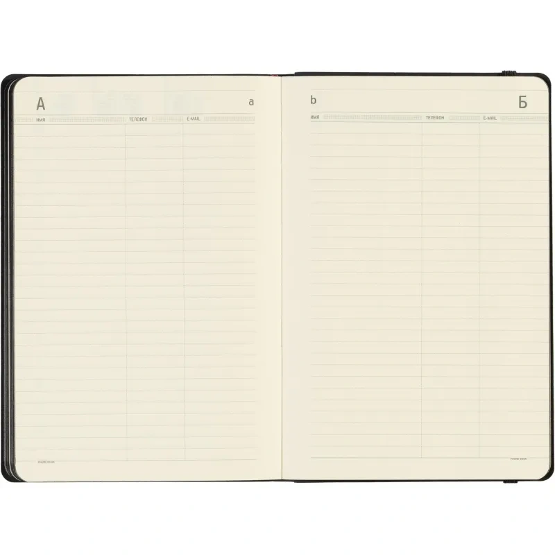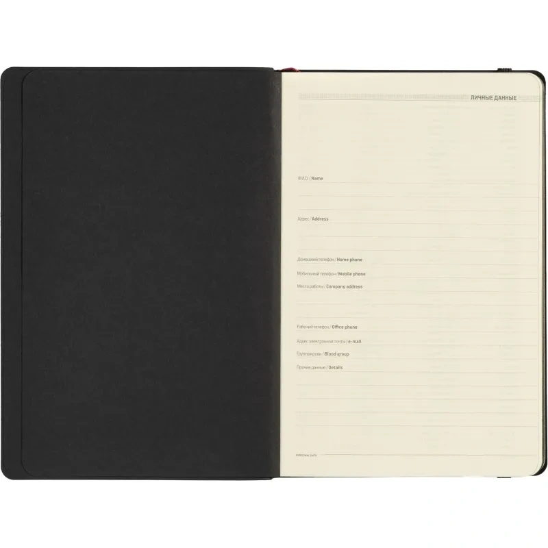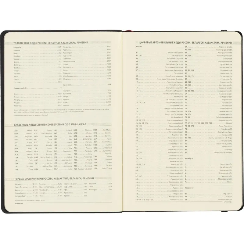 Ежедневник содержит 136 страниц тонированной офсетной бумаги плотностью 90 г/кв.м. с линейкой, подходящей для записи и заметок. Листы могут быть использованы с любого дня, так как в них предусмотрено поле для указания даты. На 18 страницах размещена справочная информация, охватывающая широкий спектр данных, включая часовые пояса, телефонные коды, религиозные праздники, единицы измерения, термины международной торговли, распад алкоголя в крови и многие другие полезные сведения.