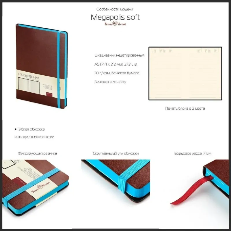 Ежедневник Megapolis Soft в универсальном формате А5 (144×212 мм) выполнен с белой обложкой из искусственной кожи. Он сочетает стильный контраст белого и чёрного цветов, где чёрная резинка и цветной обрез блокируют его в закрытом виде, добавляя элегантности. Закруглённые углы обложки и блока гармонично сочетаются, придавая ему современный и утончённый вид.