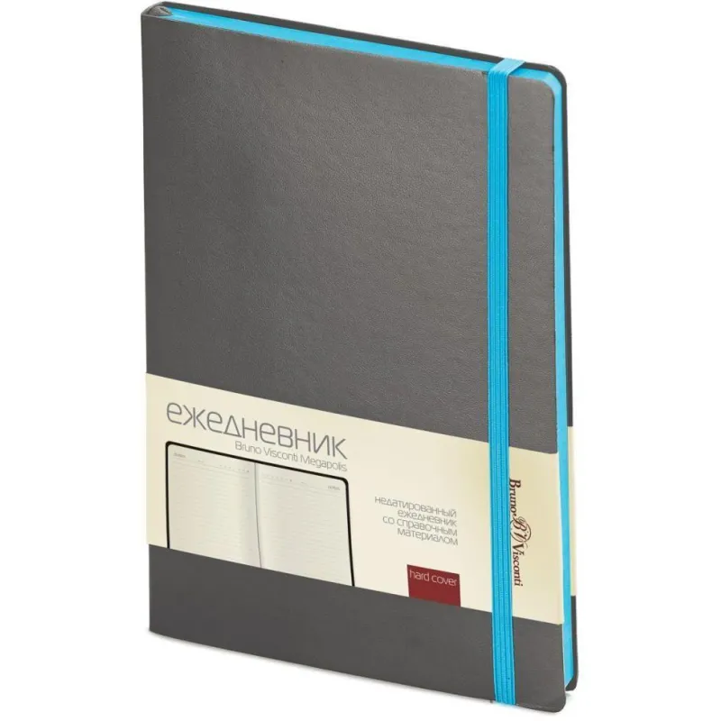 Цвет обложки: темно-серый. Цвет обреза и резинки: голубой. Megapolis Soft, прочный материал обложки. Стильного дизайна позволила добиться закругленная форма уголков обложки и блока. Темно-серый цвет обложки контрастирует с голубым обрезом и такой же фиксирующей резинкой. Этот недатированный ежедневник выпускается в универсальном формате А5. Размеры обложки 144х212 мм. Блок для записей состоит из 272 страниц бежевой бумаги с плотностью 70-90 г/кв.м. Первые 19 страниц отводятся под справочную информацию, содержащую полезные сведения (Часовые пояса, аэропорты Европы, телефонные коды, религиозные праздники, температура, единицы измерения, формат бумаги, термины международной торговли, давление, штрихкоды, буквенные коды стран, автомобильные коды РФ и СНГ, размеры одежды, скорость, энергетическая ценность продуктов, распад алкоголя в крови, страны мира). Блок снабжен шелковой закладкой-ляссе и конвертом для бумаг. На обложку этой модели можно нанести тиснение логотипа.