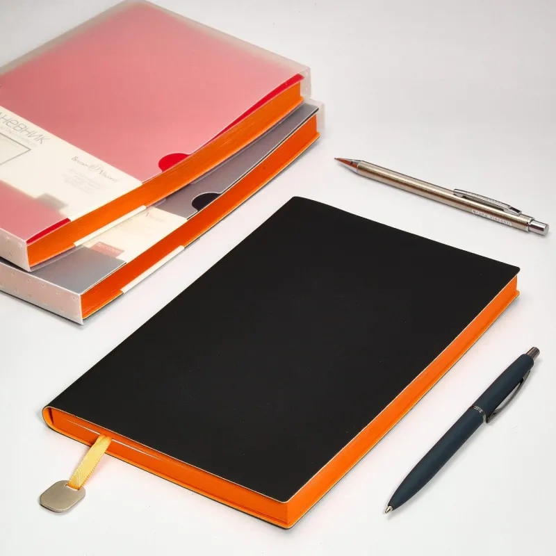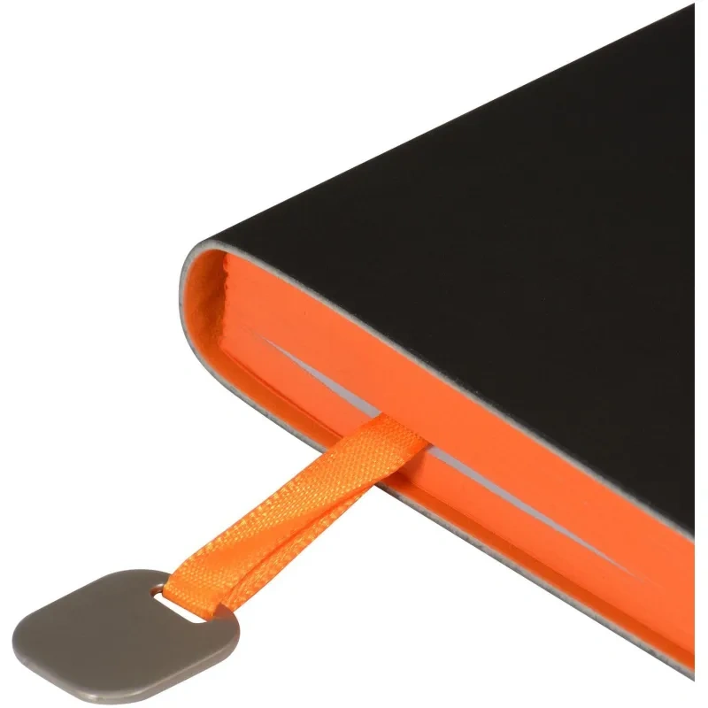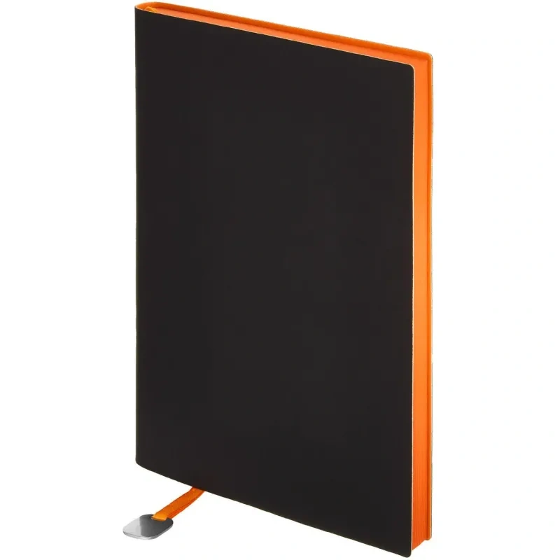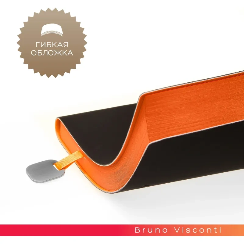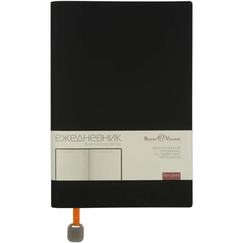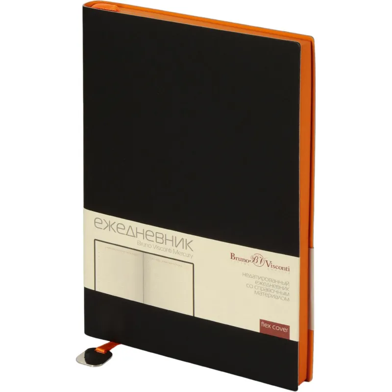 Ежедневник Bruno Visconti Mercury формата A5 (145×213 мм) с чёрной обложкой выполнен из искусственной кожи с оранжевым обрезом.
