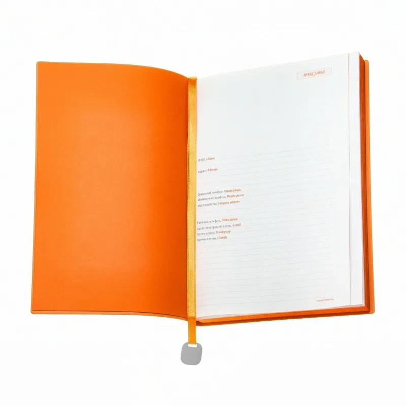 Внутренний блок состоит из 136 листов (272 страницы) высококачественной белой бумаги плотностью 70 г/кв.м. с линовкой в линейку и печатью в два цвета. Двойная оранжевая закладка-ляссе с шильдом добавляет функциональности и позволяет легко находить нужные записи. Внутри ежедневника содержится информационно-справочный блок, включающий международные коды городов, европейские аэропорты, цифровые коды ГИБДД, среднемесячную температуру, телефоны первой необходимости, штриховой код, неметрические единицы, междугородные коды России и мира, денежные единицы и размеры одежды.