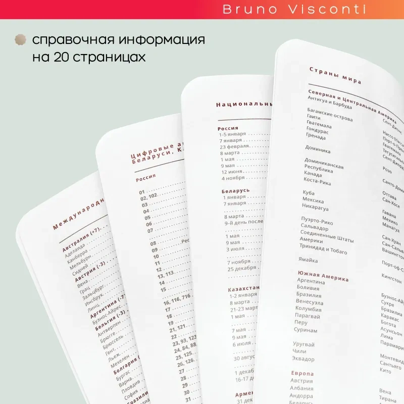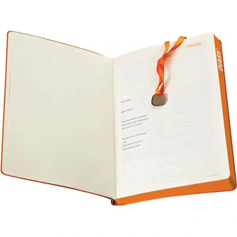 Внутренний блок состоит из 136 листов (272 страницы) высококачественной белой бумаги с плотностью 70 г/кв.м., с линовкой в линейку и печатью в два цвета. Двойная оранжевая закладка-ляссе с шильдом добавляет элегантности и помогает быстро найти нужные записи. Блок содержит полезный информационно-справочный раздел, включая международные коды городов, европейские аэропорты, цифровые коды ГИБДД, среднемесячную температуру, телефоны первой необходимости, штриховой код, неметрические единицы, междугородные коды России и мира, денежные единицы и размеры одежды.