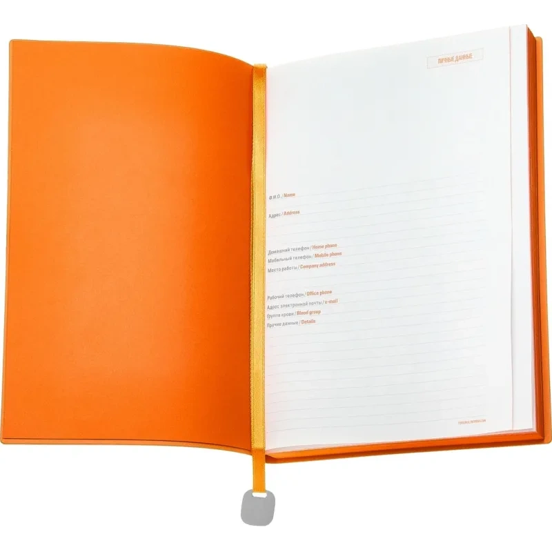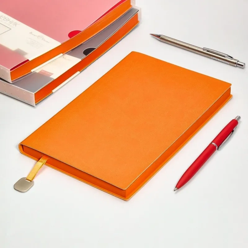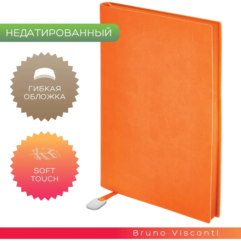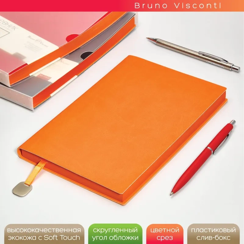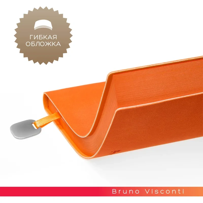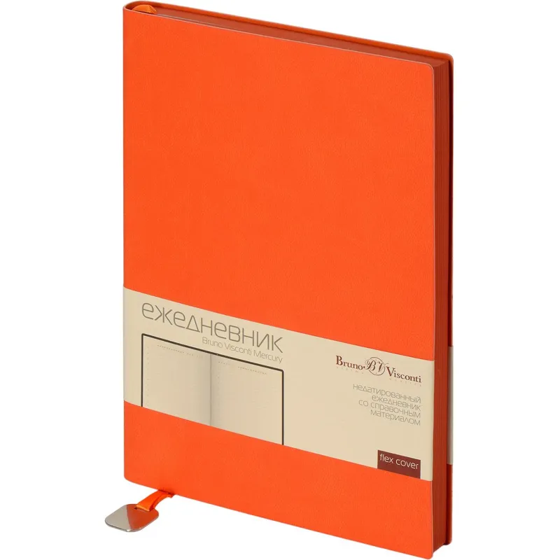 Ежедневник Bruno Visconti Mercury формата A5 (145×213 мм) с мягкой обложкой оранжевого цвета выполнен из искусственной кожи с оранжевым обрезом, что придаёт ему яркий и стильный вид.