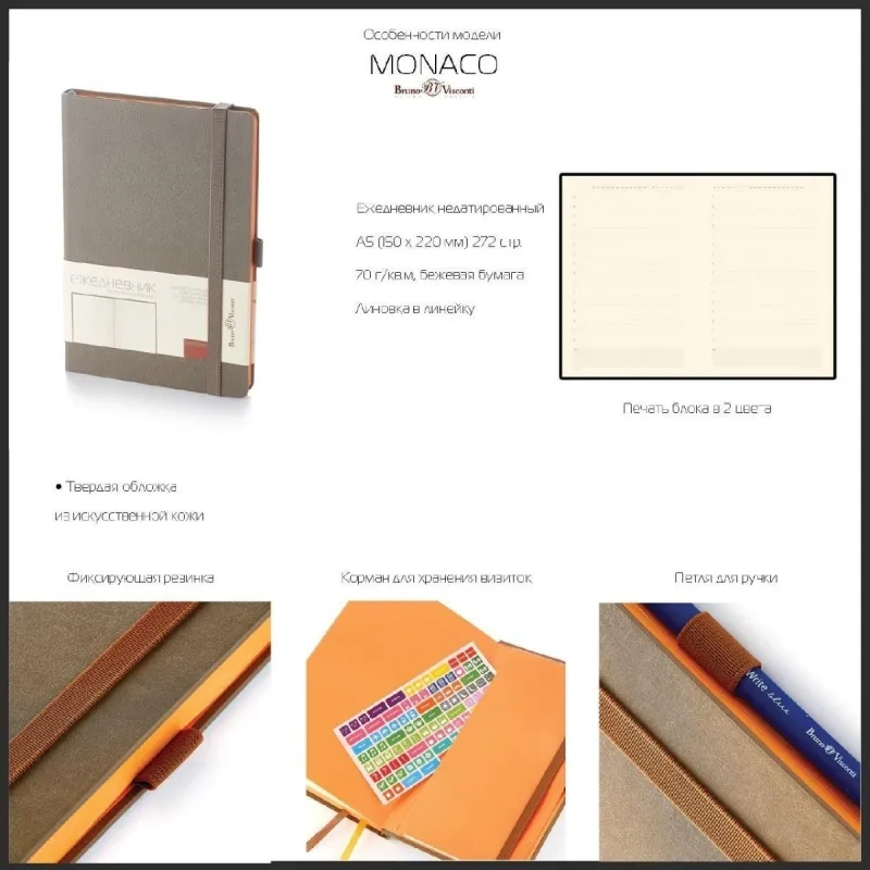 Ежедневник недатированный Bruno Visconti Monaco искусственная кожа А5 136 листов коричневый с фиксирующей резинкой (оранжевый обрез)