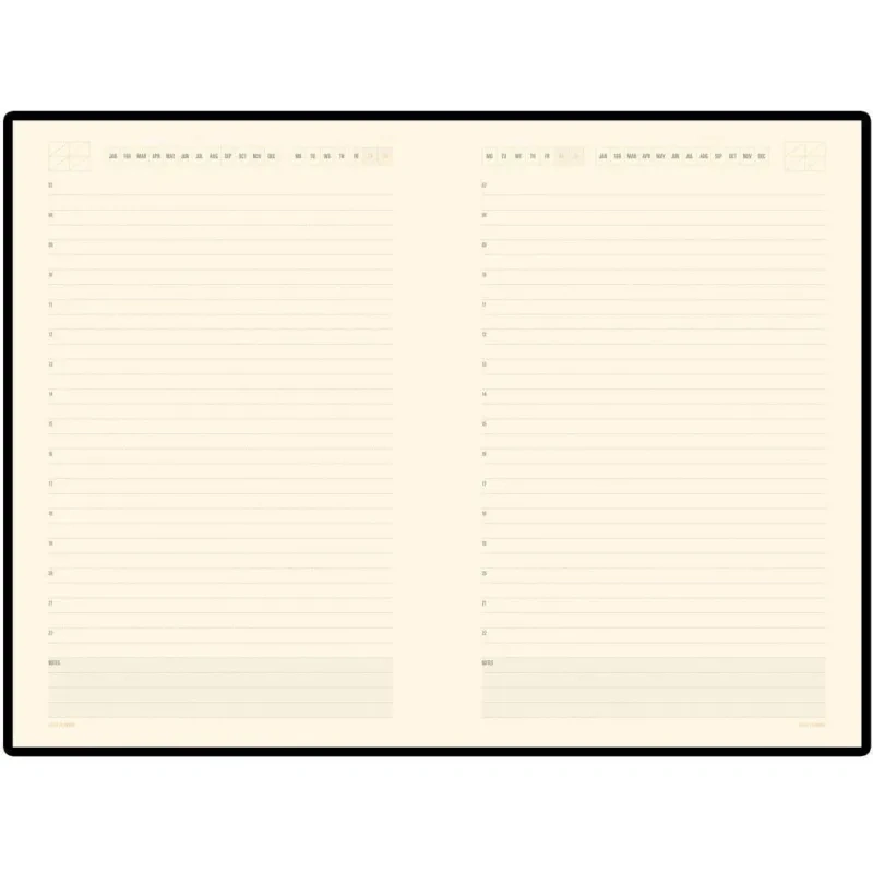 Внутренний блок состоит из 136 страниц высококачественной бежевой офсетной бумаги плотностью 90 г/кв.м., с линовкой в линейку для записи. Внутри предусмотрены графы с временем, что помогает организовать день. На первых 20 страницах собрана полезная справочная информация: часовые пояса, телефонные коды, автомобильные коды, термины международной торговли и другие данные. Также есть страничка для личной информации.