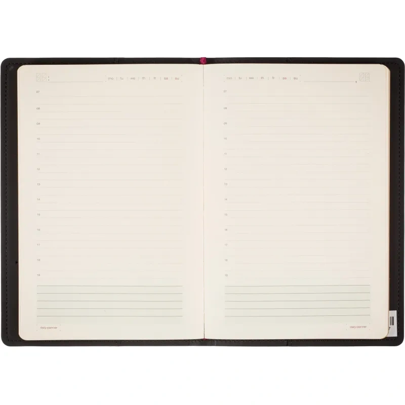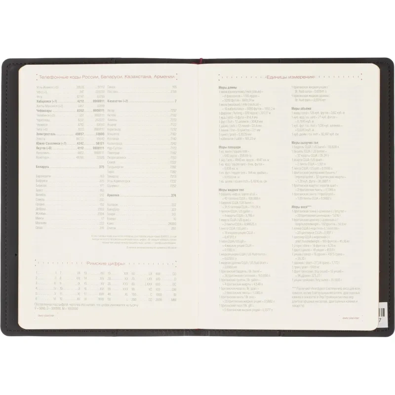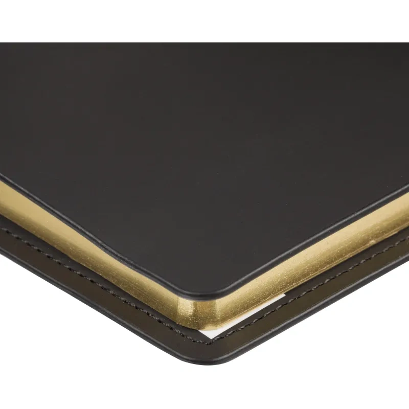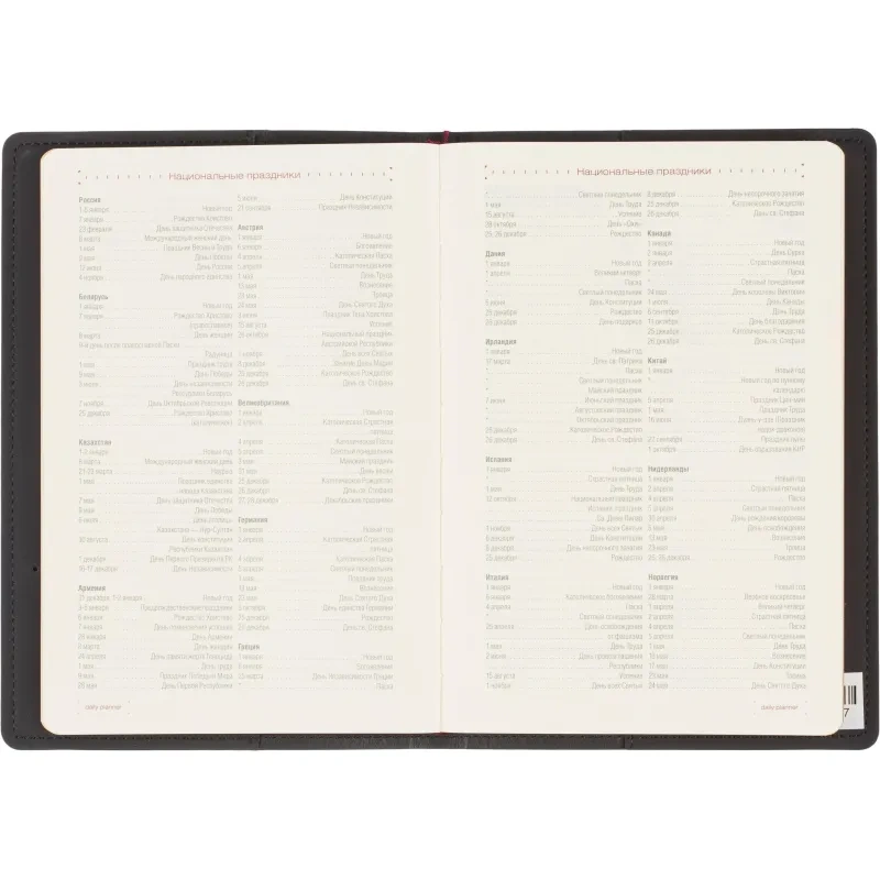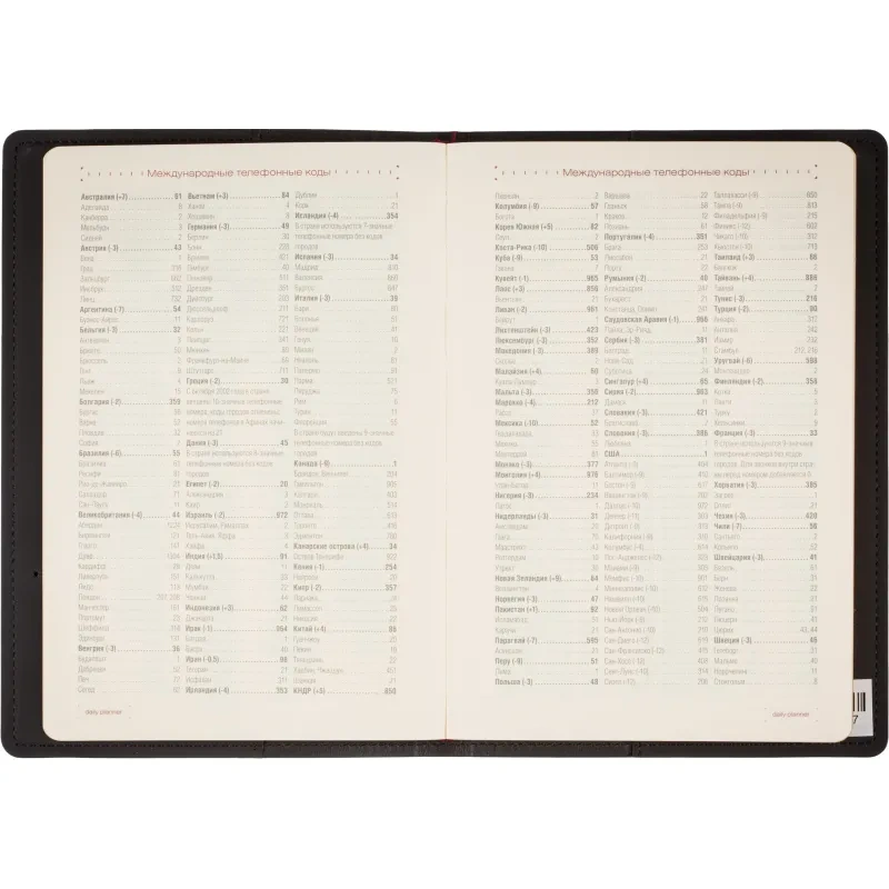 Ежедневник формата A5 с мягкой обложкой чёрного цвета, выполненной из искусственной кожи, станет удобным и стильным инструментом для деловых людей. Обложка имеет фиксирующую резинку для надёжности и долговечности. Внутренний блок состоит из 136 листов (272 страницы) тонированной бумаги с золотистым обрезом, плотностью 90 г/кв.м., с линейкой. Печать выполнена в два цвета.