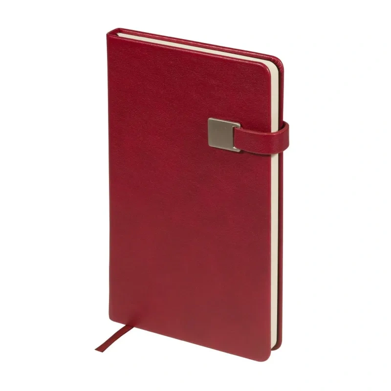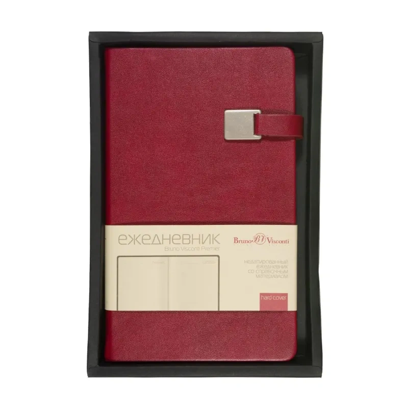 Ежедневник недатированный Bruno Visconti Premier искусственная кожа А5 136 листов бордовыйЕжедневник Premier формата A5 от Bruno Visconti - это элегантный и практичный аксессуар с твёрдой обложкой из высококачественной искусственной кожи бордового цвета. Обложка дополнена металлическим хлястиком на магните. Ляссе в цвет обложки позволяет быстро находить нужные страницы, а перфорированные и скруглённые углы блока делают использование ежедневника ещё более удобным.Внутренний блок состоит из 272 страниц бежевой офсетной бумаги плотностью 70 г/кв.м. и включает раздел с 19 страницами справочной информации. Линовка с линиями позволяет легко организовать записи и планировать дни. Этот ежедневник подходит для персонализации.