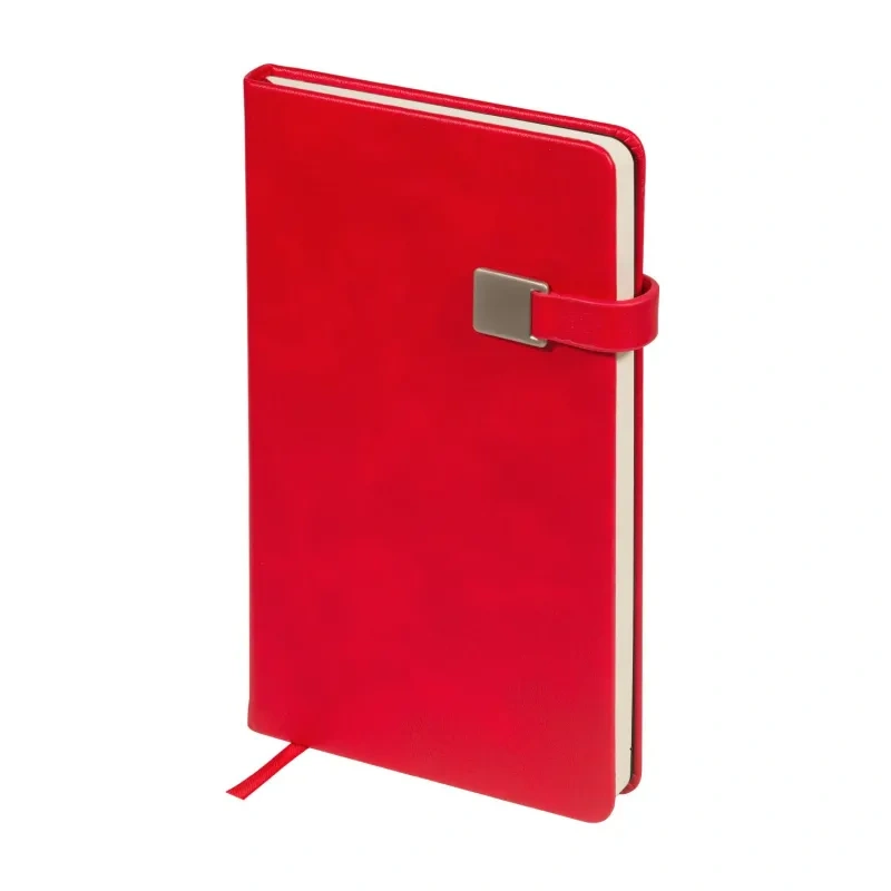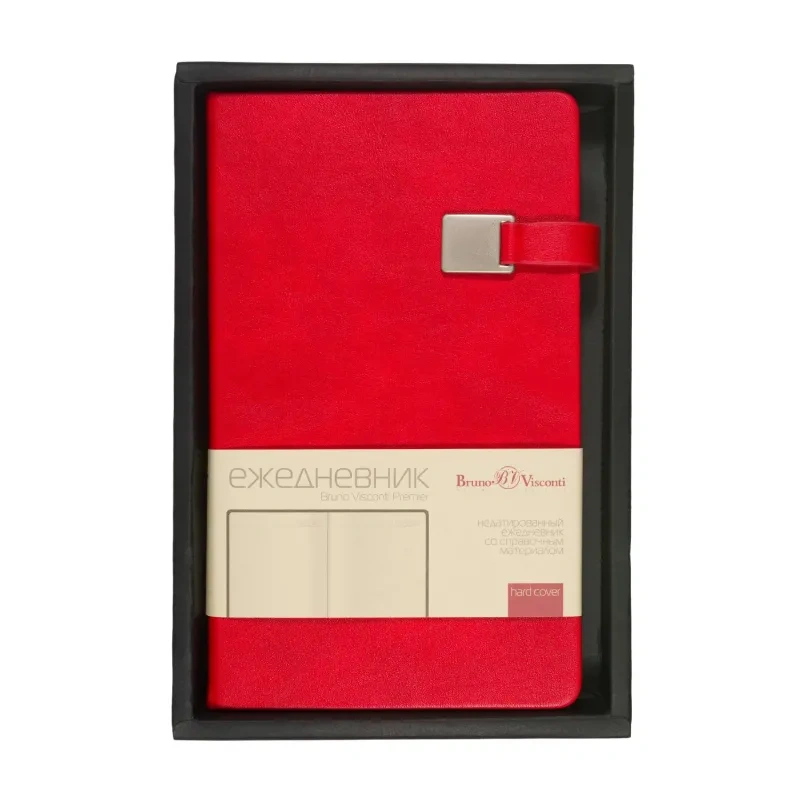 Недатированный ежедневник Premier формата A5 от Bruno Visconti сочетает в себе удобство и стиль. Твёрдая обложка из высококачественной искусственной кожи красного цвета украшена металлическим хлястиком на магните, который надёжно закрывает ежедневник. Ляссе в цвет обложки помогает быстро находить нужную страницу.