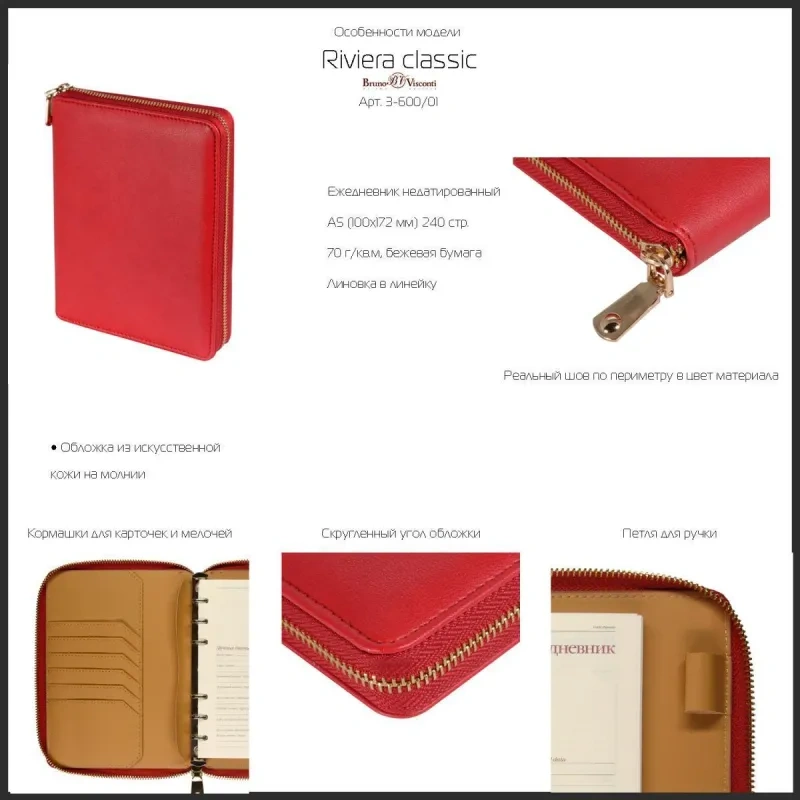 Внутри на металлических кольцах крепится сменный блок из 120 листов качественной бежевой офсетной бумаги плотностью 90 г/кв.м. Линовка комбинированная, что делает его универсальным для различных типов записей. Ежедневник имеет размеры 10×17,2 см и подходит для персонализации, что позволяет добавить логотип компании или уникальный дизайн на обложку.