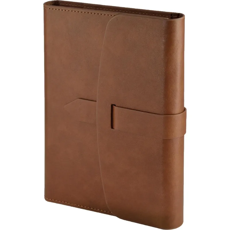 Ежедневник формата A5 с твёрдой обложкой коричневого цвета, выполненной из искусственной кожи, станет отличным аксессуаром для деловых людей. Внутренний блок состоит из 136 листов (272 страницы) бежевой офсетной бумаги плотностью 90 г/кв.м. с линейкой. Печать выполнена в два цвета.